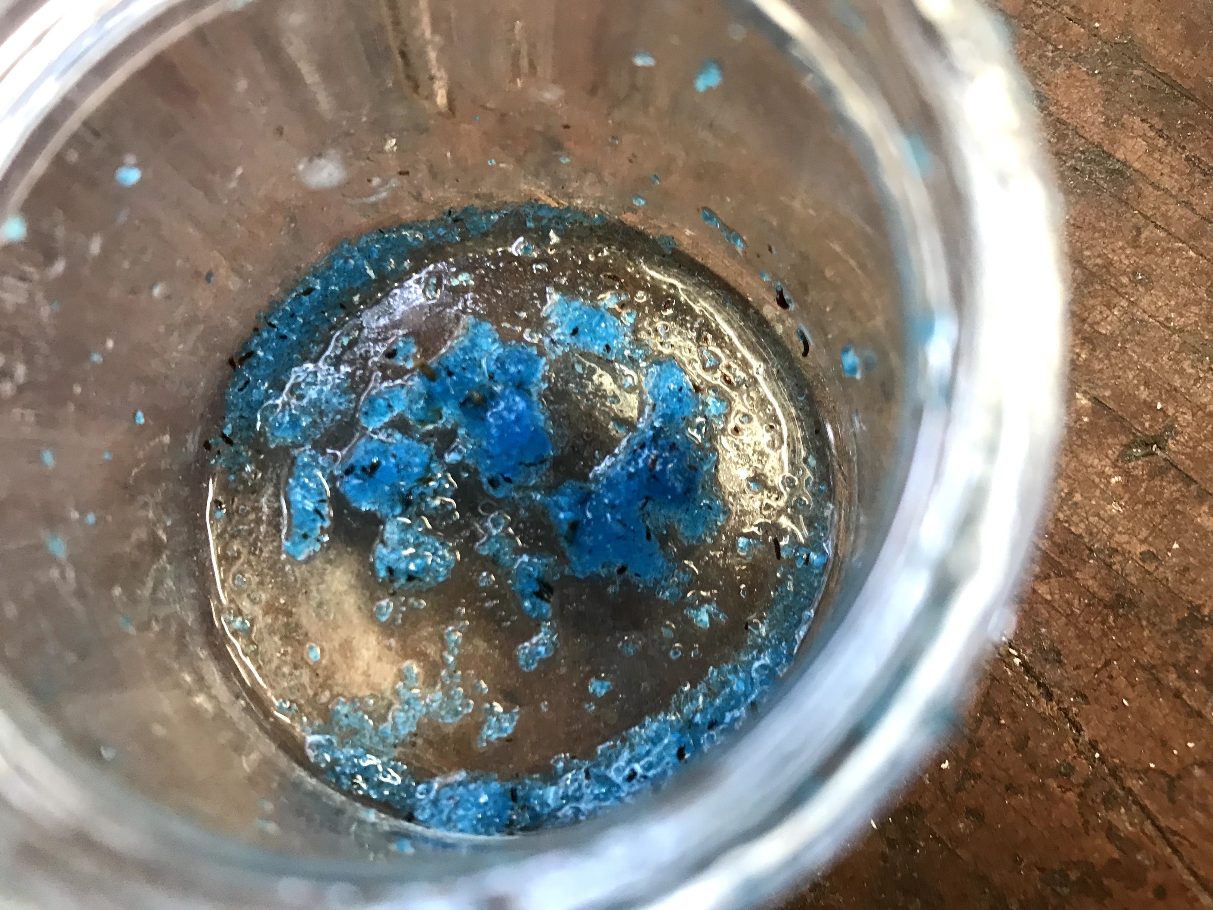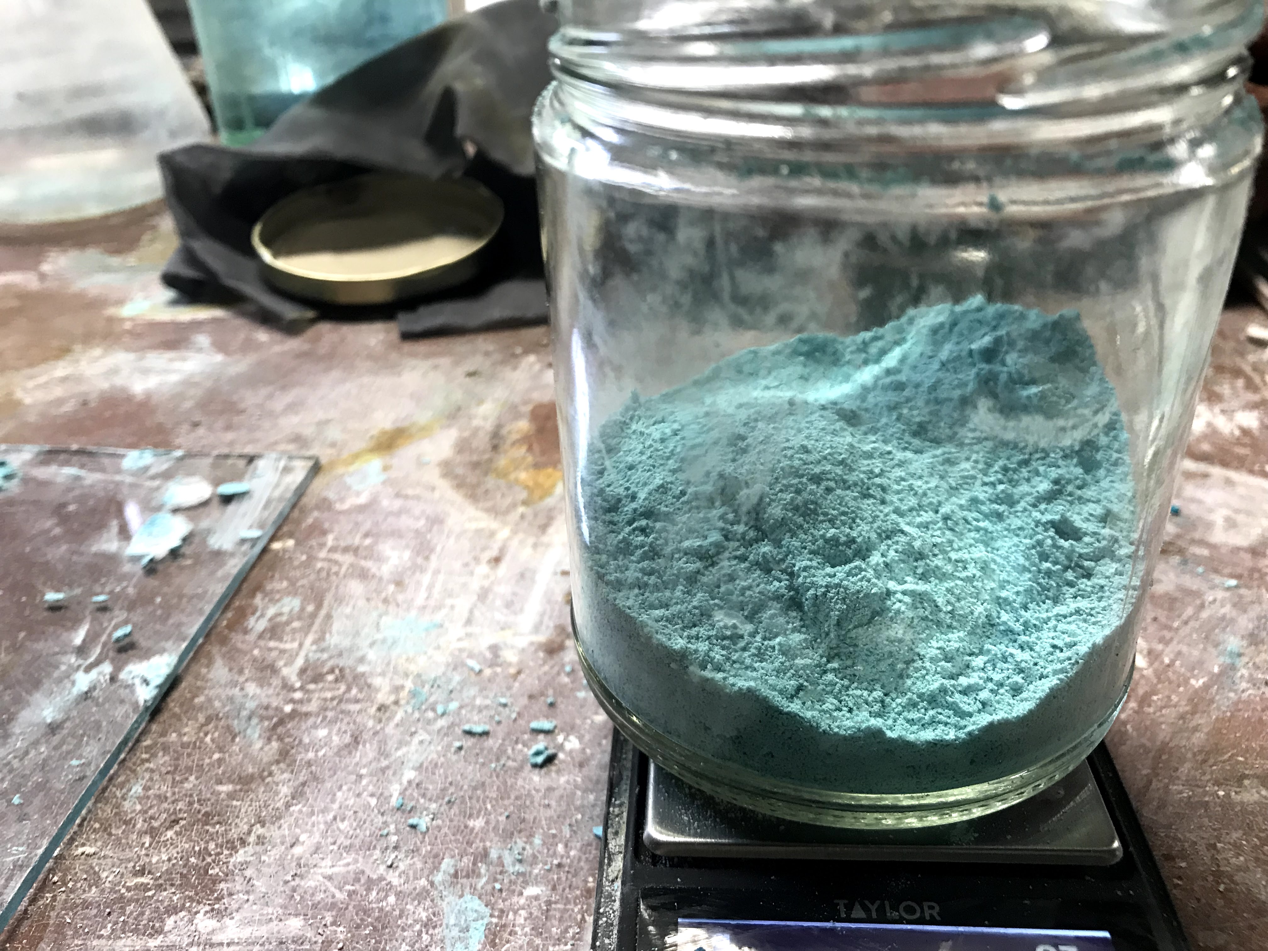 Creating green verditer took a couple of attempts to get right. I also wanted to make it sooner than I did in the end, but I was also trying to make my own copper sulfate. I later figured out that I had been making copper sulfate correctly, but I was not patient enough to let it fully evaporate. Making copper sulfate involves adding copper to oxidized sulfuric acid. I thought that copper sulfate would precipitate in the liquid, but the liquid evaporates and leaves copper sulfate crystals. I did end up with a small batch of copper sulfate crystals, but I ended up buying some copper sulfate pentahydrate from a hardware store.