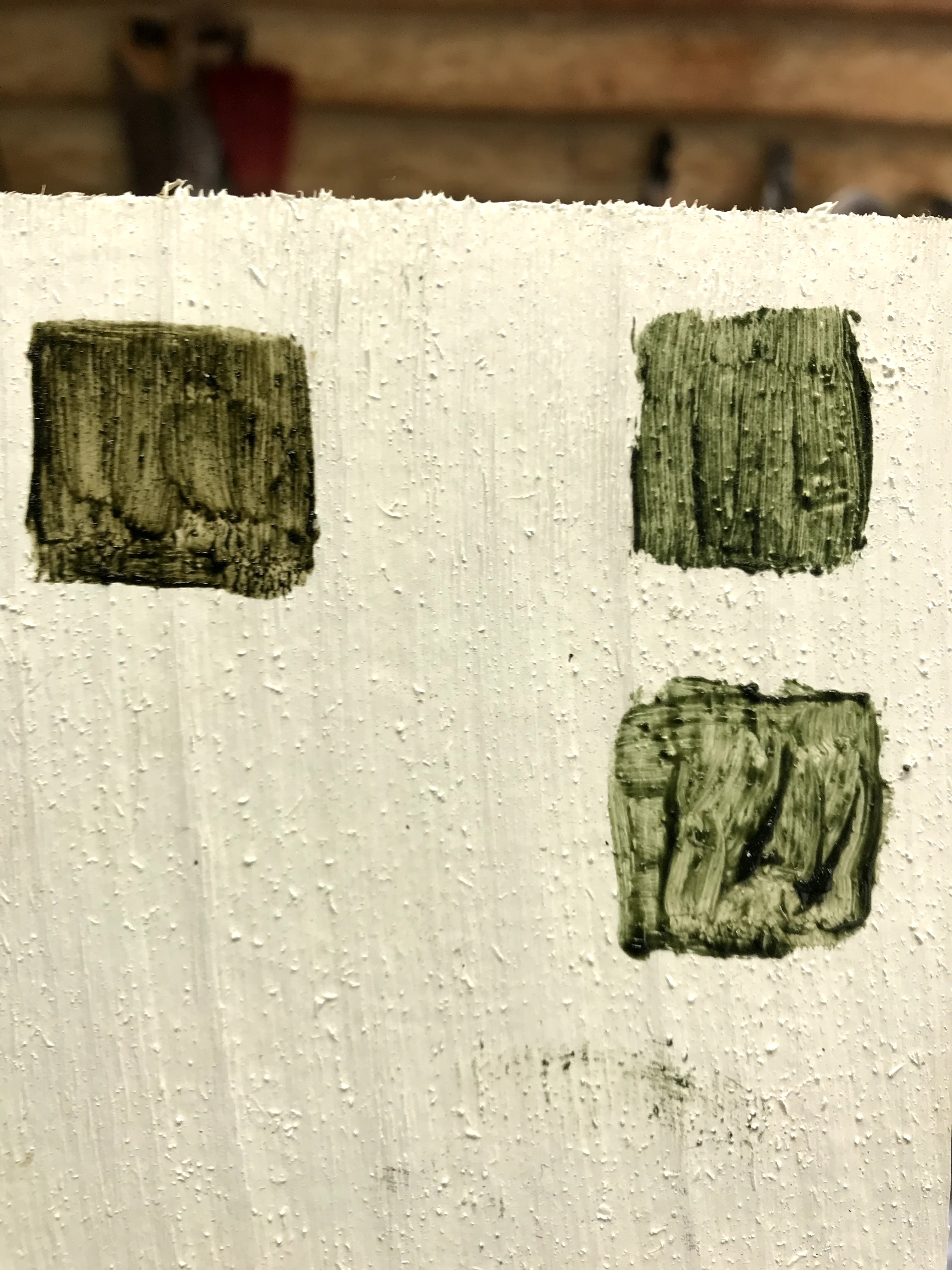 As I went, I quickly made up some oil paints of the pigments I was working with to compare them and test their color in application. I am still a little shocked by how different the colors of the powder pigments are from the paints they create. I tried to make a neatly organized and labeled test board, but I will explain it in more depth.