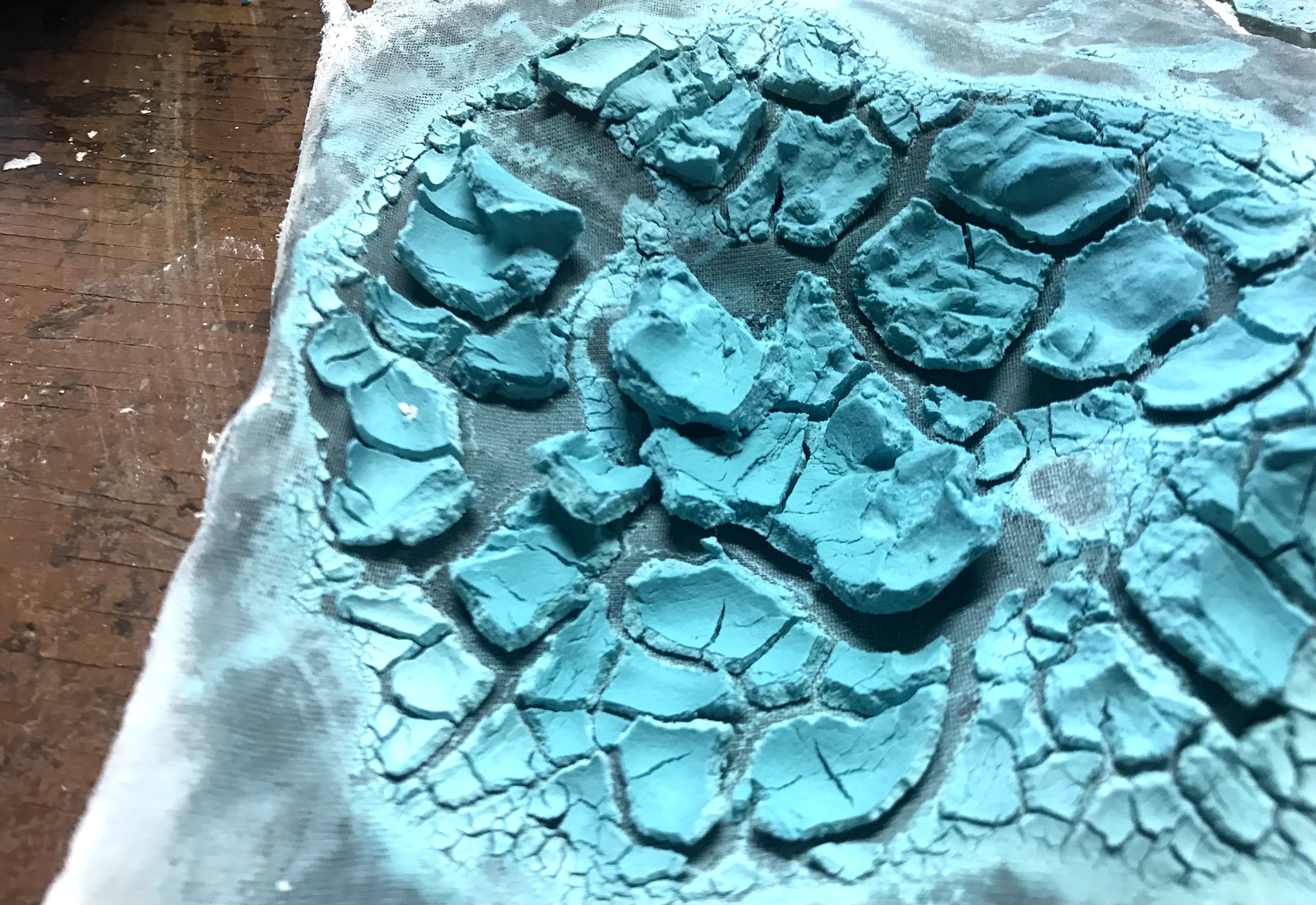 Verditer v. 1 was the result from my first attempt using equal parts copper sulfate and sodium carbonate. There were two distinctly colored sections of the powder as it dried. When these two powders were made into paint, the darker, greyer powder made the top leftmost square. The baby blue powder from the first attempt made the two squares in the top right corner.