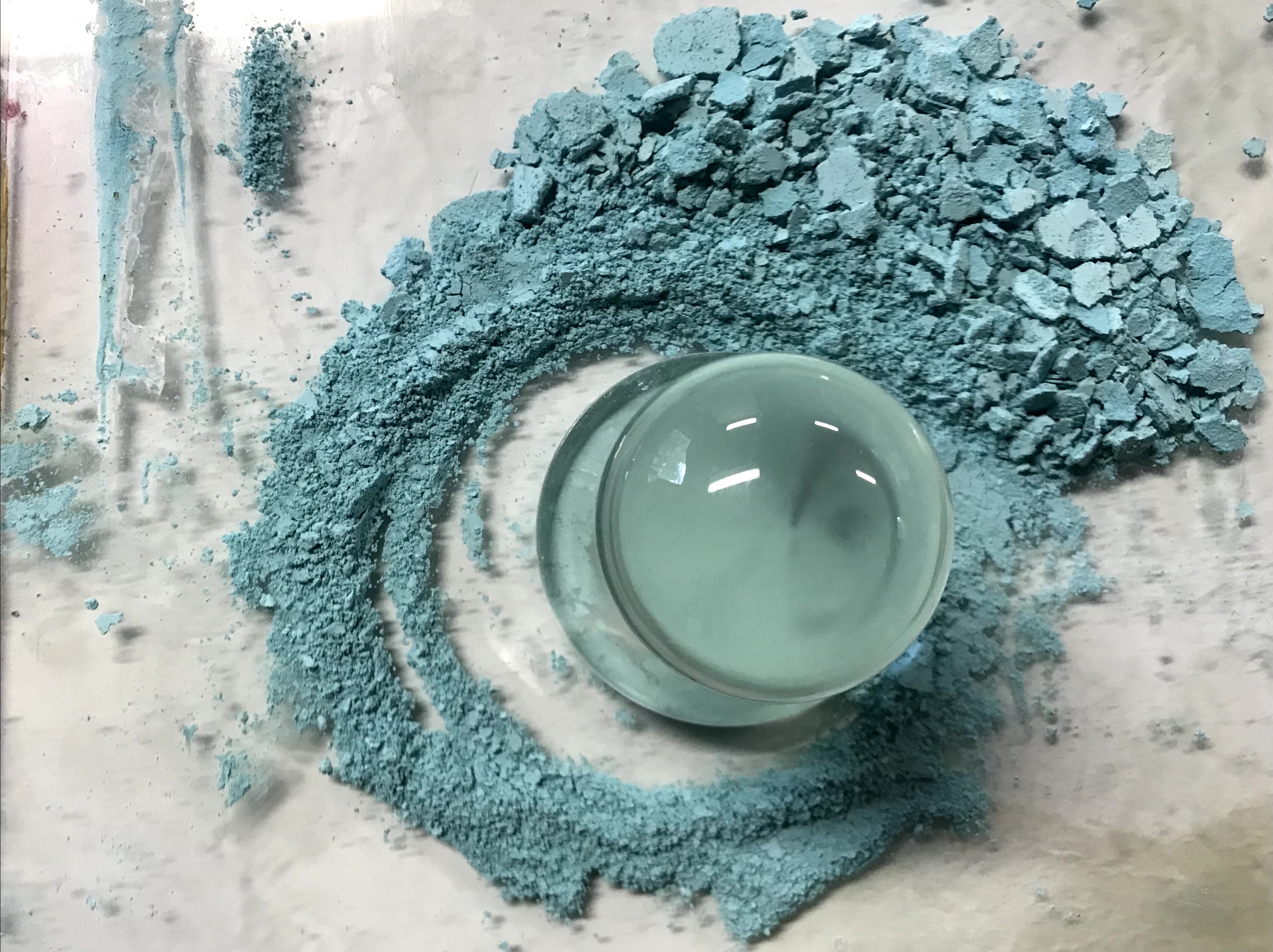 The second attempt was much more successful than the first. Once the copper carbonate had fully dried, I ground it up into a fairly fine powder. Sources that I have read mention that malachite can go pale if it is ground too finely. With hand grinding the pigment, I am not too worried about making it into too fine of a powder to lose color.