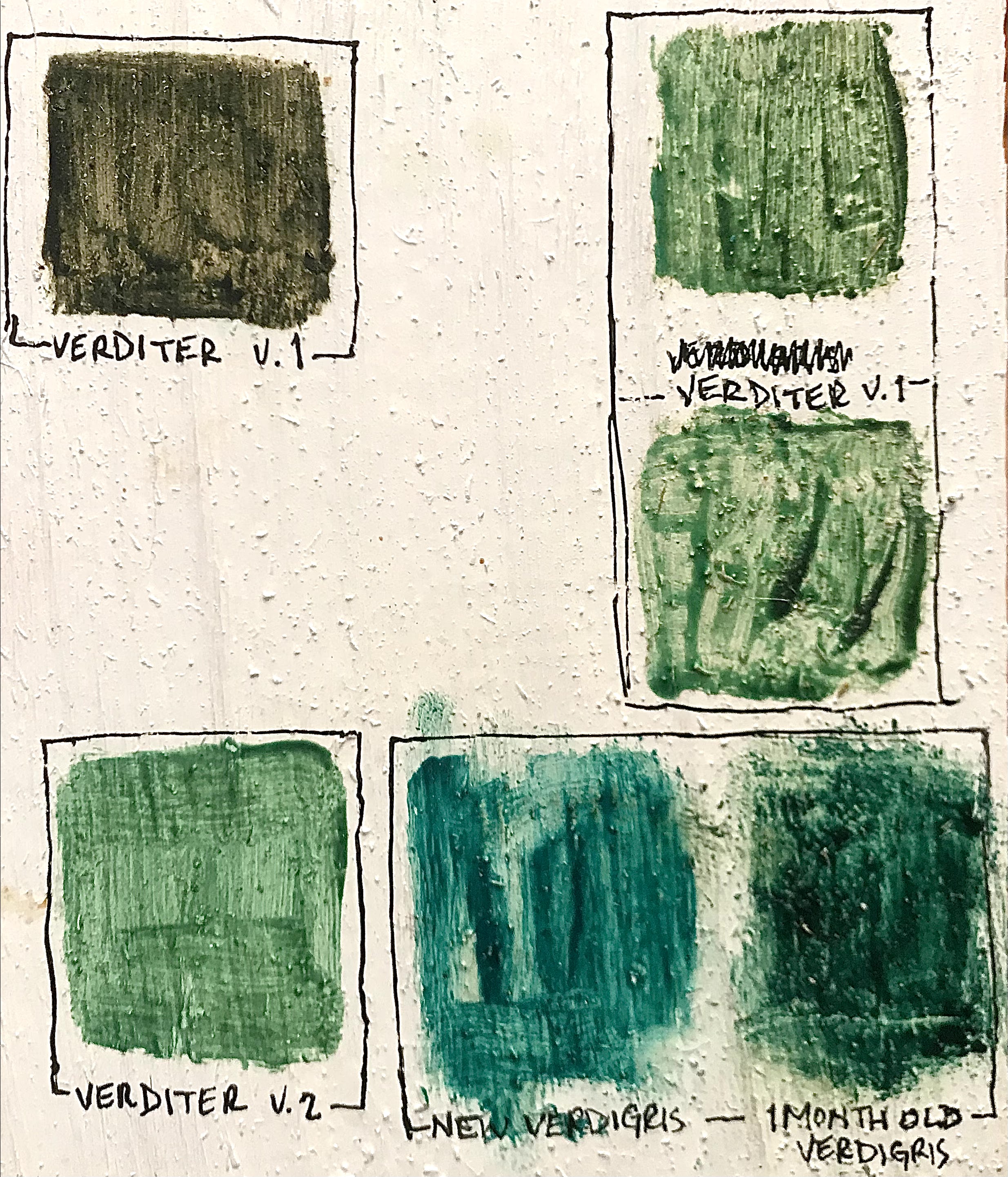 Verditer v. 2 is the paint made from my second attempt, which was more successful. This was what I expected out of a green verditer pigment. Although, the top right squares from Verditer v. 1 look similar to the v. 2 square, they are a little more muddy of a green. The Verditer v. 2 color is more purely green, without the hits of brown or yellow that come through in the Verditer v. 1 squares.