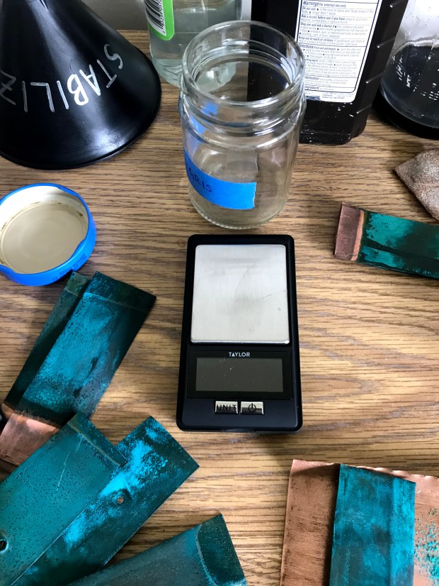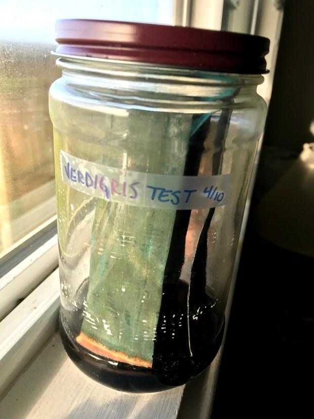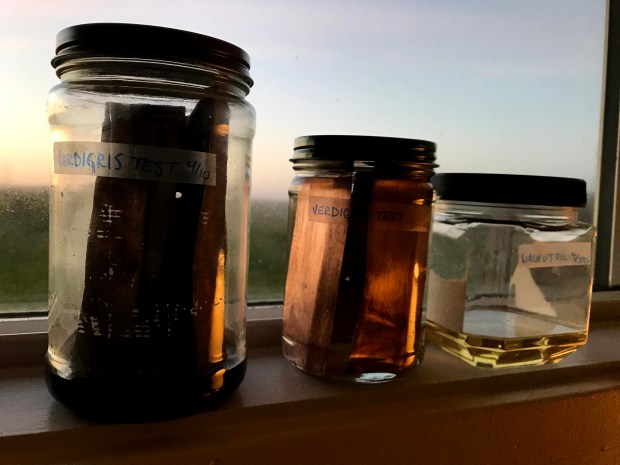 I tried just scraping off the existing patina on the flashing, but that turned brown when added to oil. I then set on resurfacing the sheets, which had become tarnished after exposure to the sun and ocean air for years. After that, the only thing left to do was place some copper sheets in a jar with vinegar.