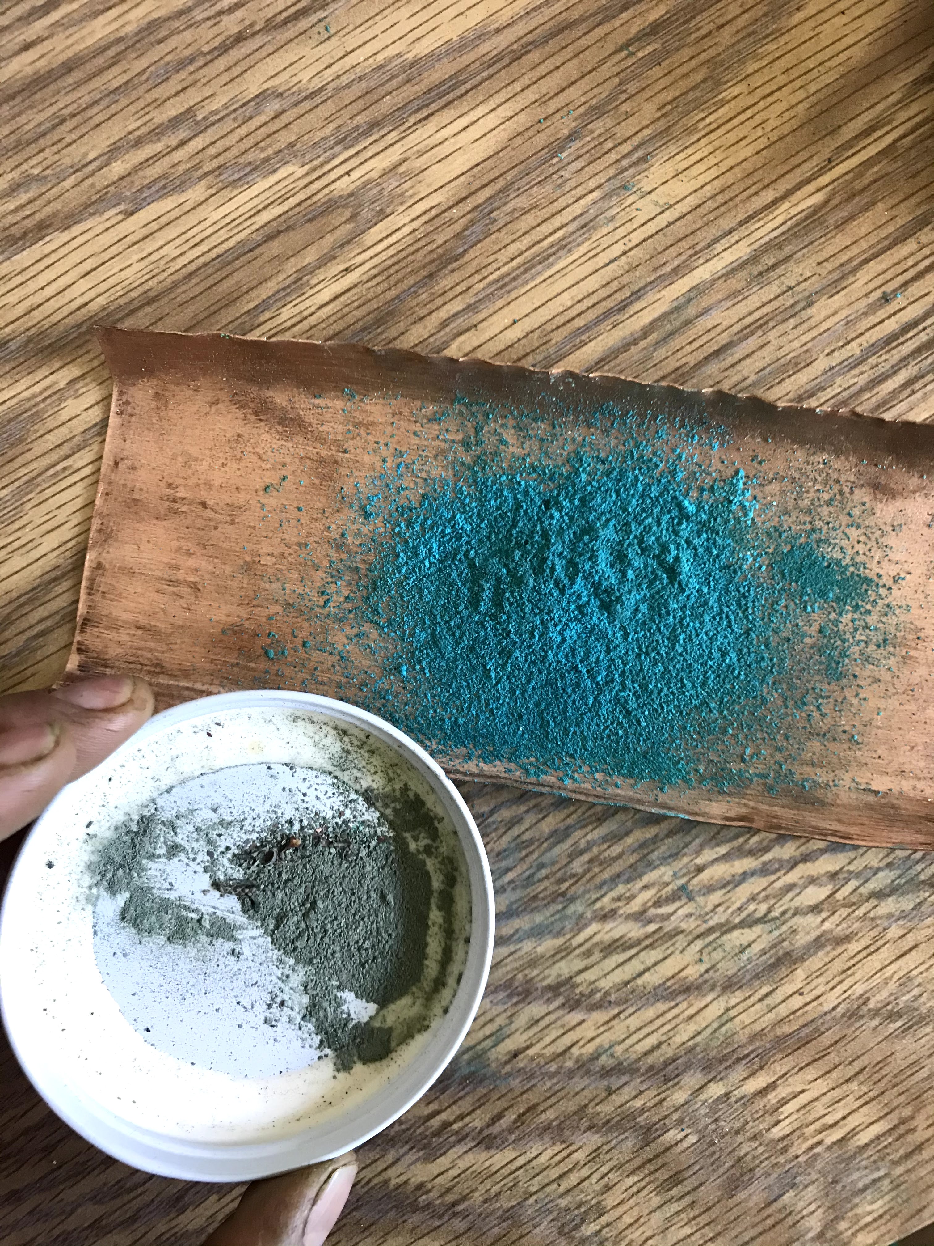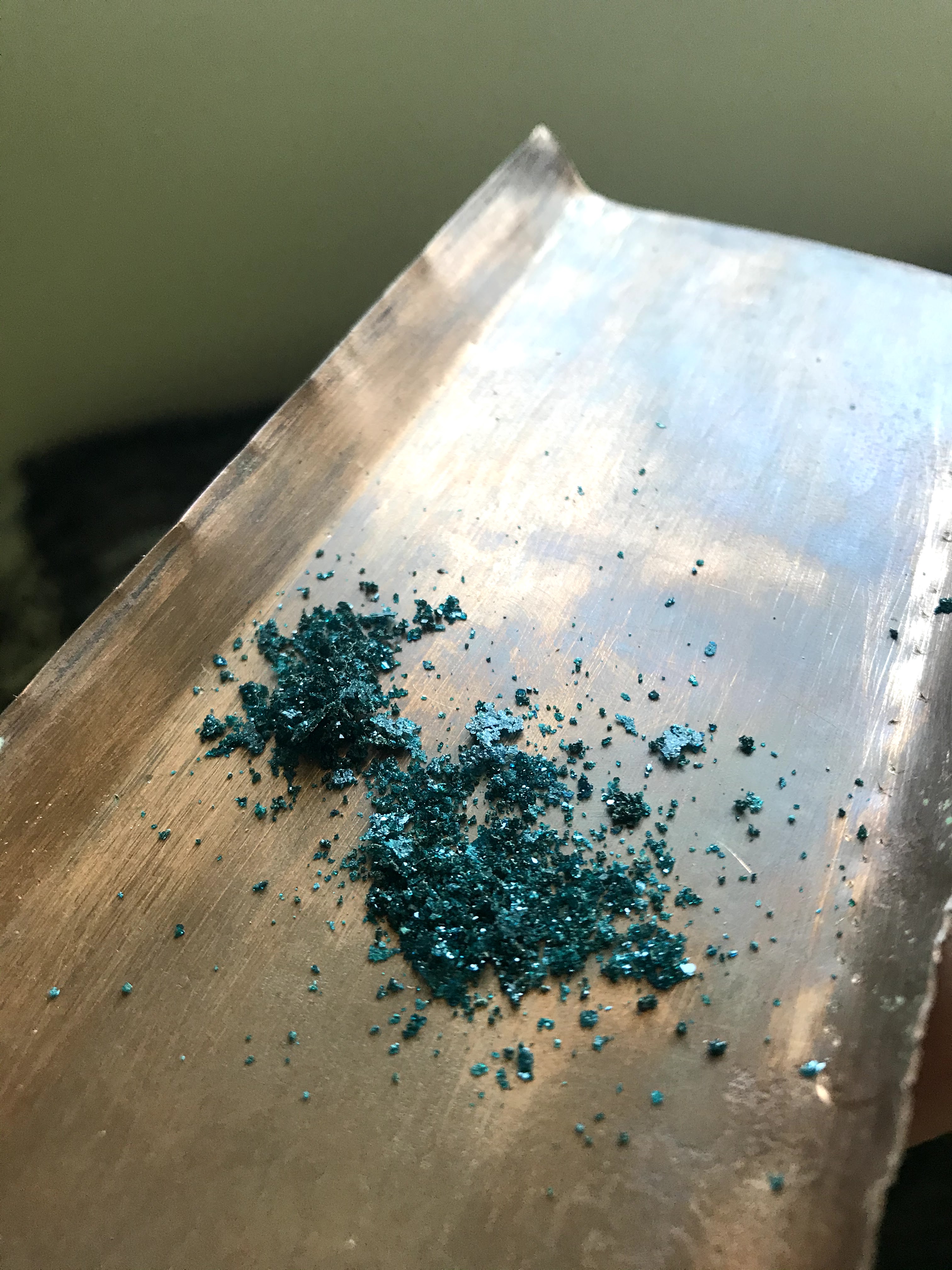 I also added the step of neutralizing the verdigris. To do so, the verdigris that is freshly scraped off of the copper sheet gets redissolved in vinegar. As the vinegar and water evaporate, the verdigris recrystallizes and becomes more stable in paints.