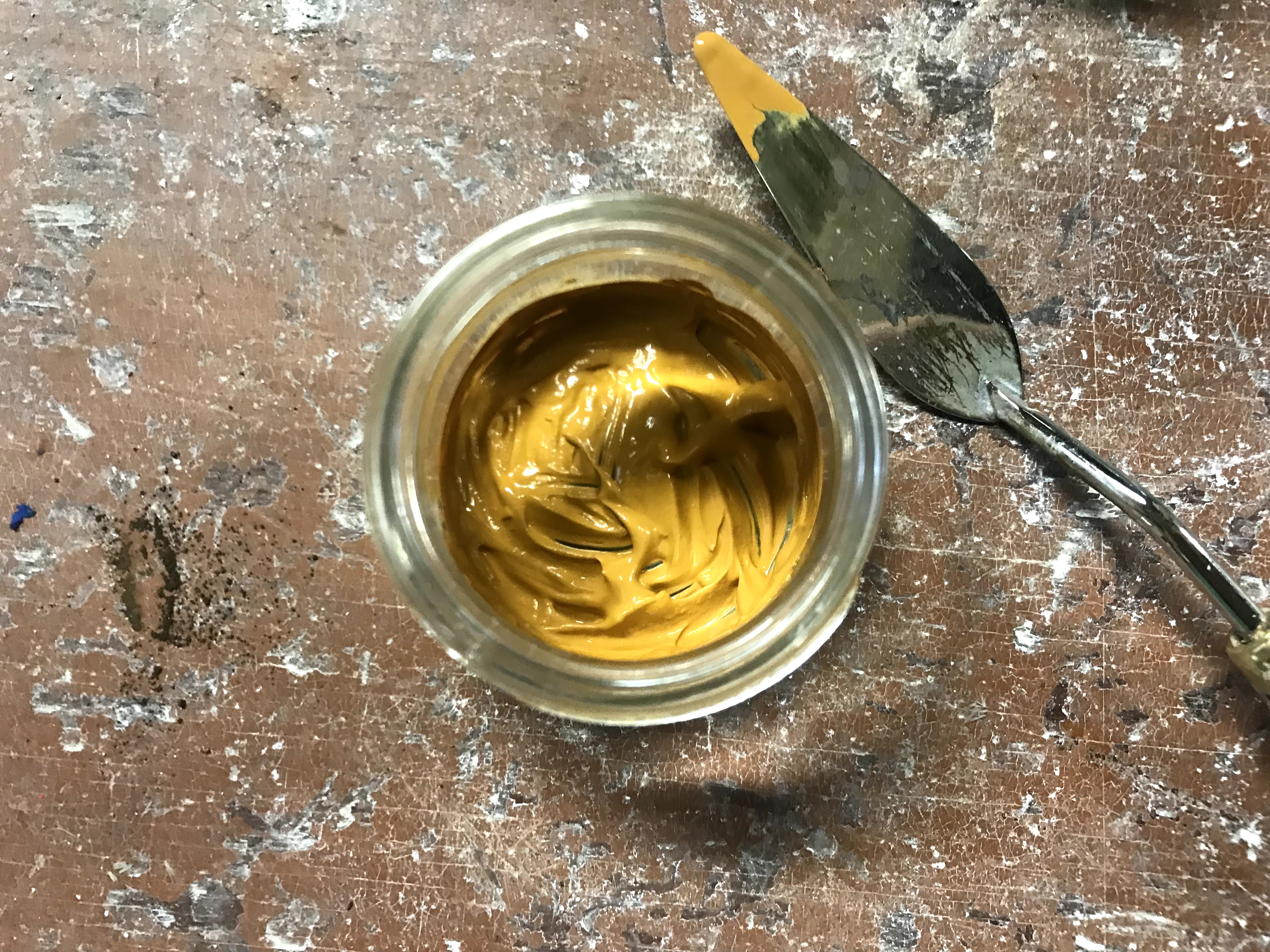 This is a yellow ochre distemper I made for fresco painting. It can be used in this viscosity, or it can be watered down according to what the plaster responds to best.