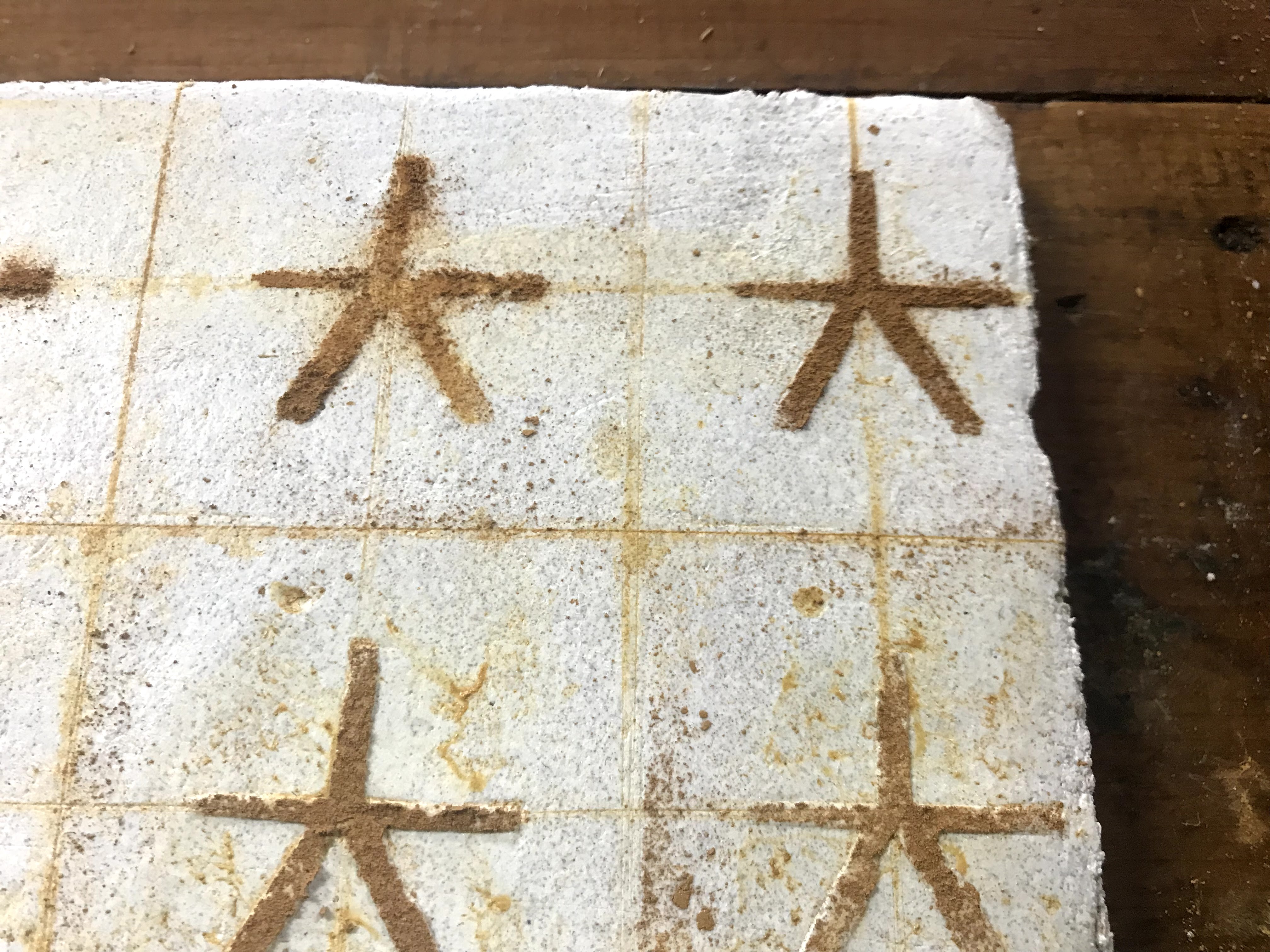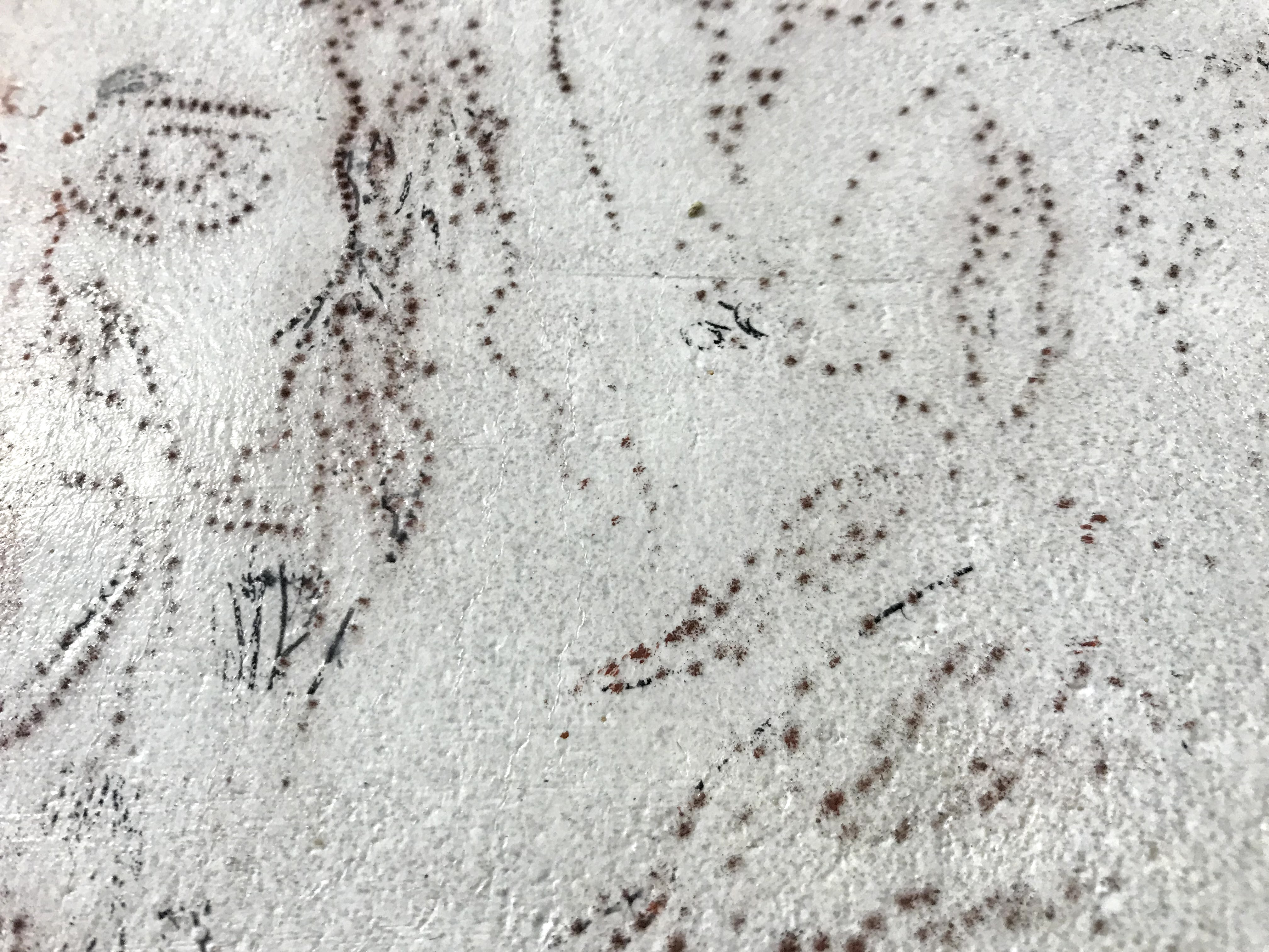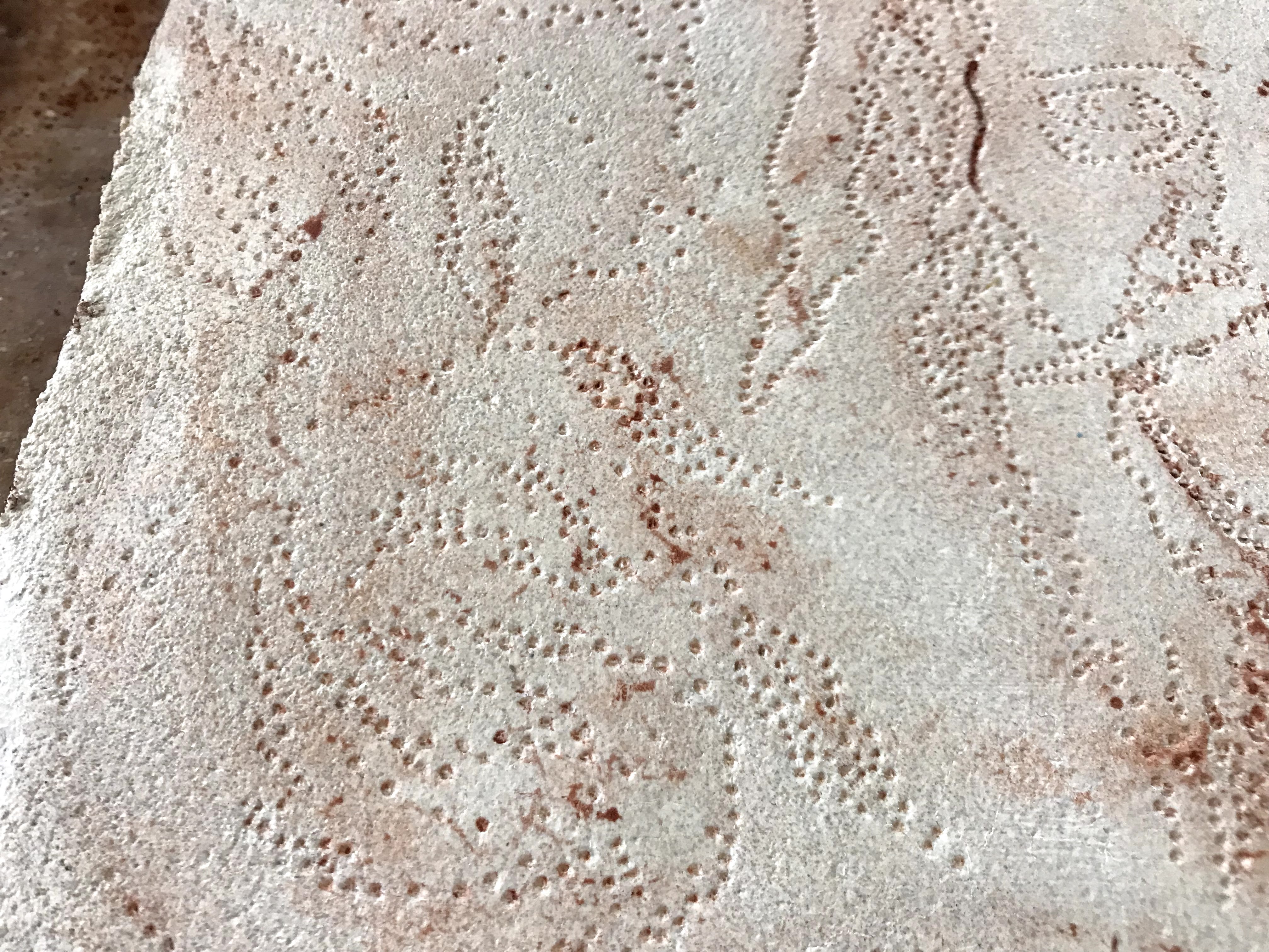 My methodology followed my earlier attempts for the most part. I laid down the first plaster layer and let that completely set up. Once the first layer was dry and I was ready for the next layer, I dampened the first layer and laid the second. As the second layer dried, I prepared the design to transfer onto the plaster. I tried two methods of transferring the design. I drew out the design, but I only punched through one half of the drawing. The punched paper can be pressed into the plaster to leave small dots in the plaster’s surface. The paper can be flipped over, and the holes left by the punches allow pigment to be pushed through and leave dots on the plaster’s surface that are easily traced to accurately recreate the image.