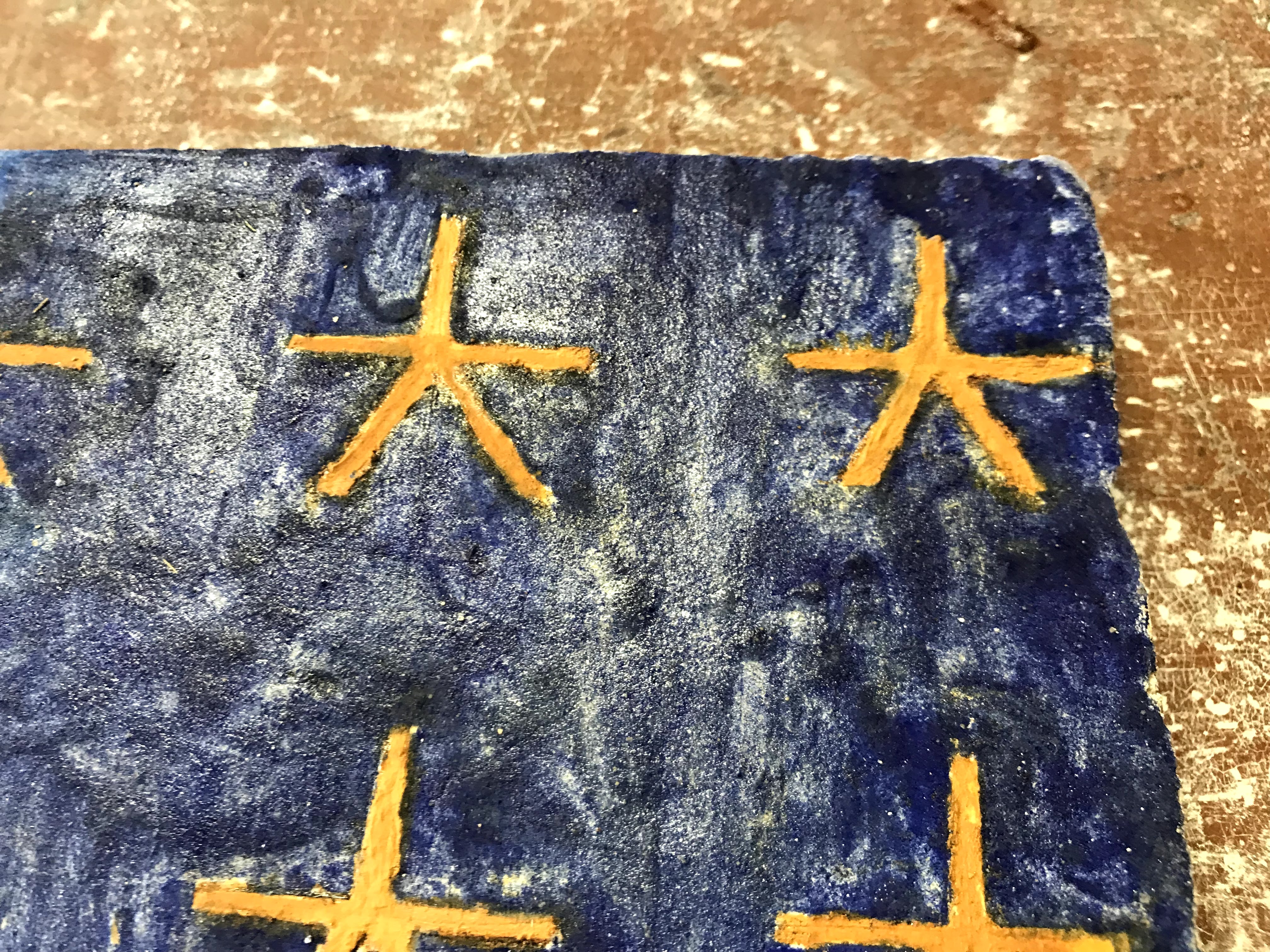 I tried laying out a design for the first fresco, but it was still a little to wet. I also tried using smalt for the background, which is a pigment made from blue glass. Smalt has to be ground coarsely, otherwise it would have no color to it, and I think because of its coarseness, it did not sink into the plaster.