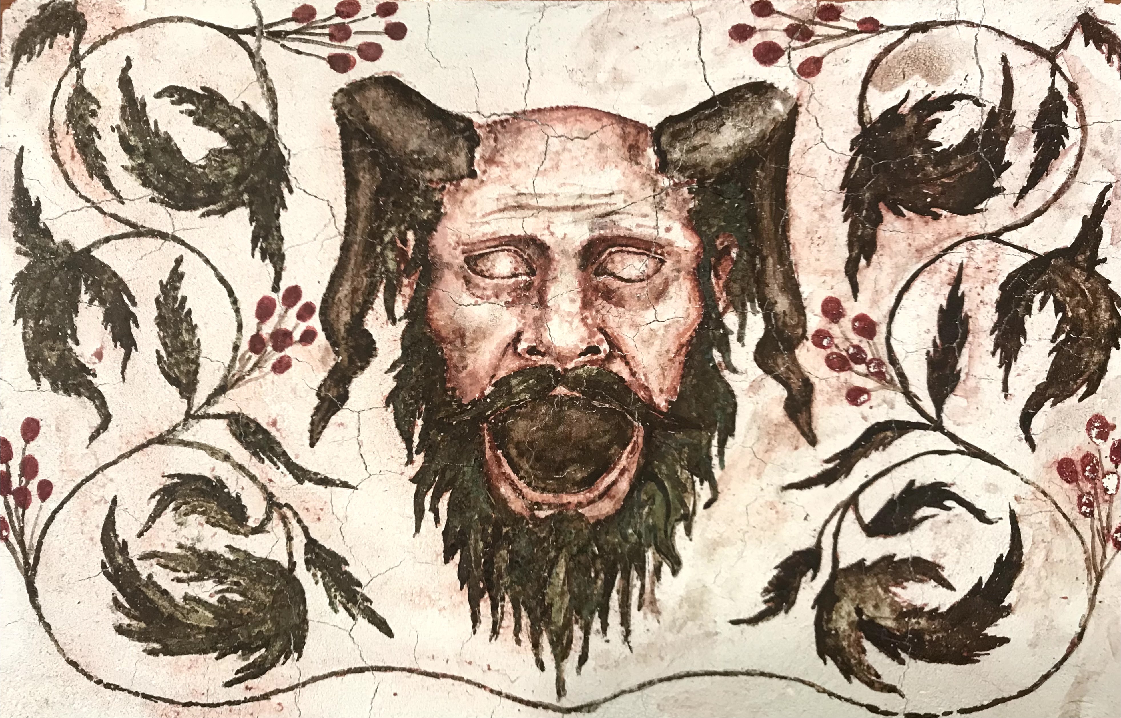 My design features a horned human face with a wide open mouth, as well as a scrolling plant motif. The plant is baneberry, which grows fairly abundantly in Northern Minnesota. Its berries are more vibrantly red in person than I could paint. It is also toxic, so I thought that it fit the grotesque thematically. I also tried to incorporate the baneberry leaves into the beard on the figure, but that proved to be much more difficult to implement in a fresco.