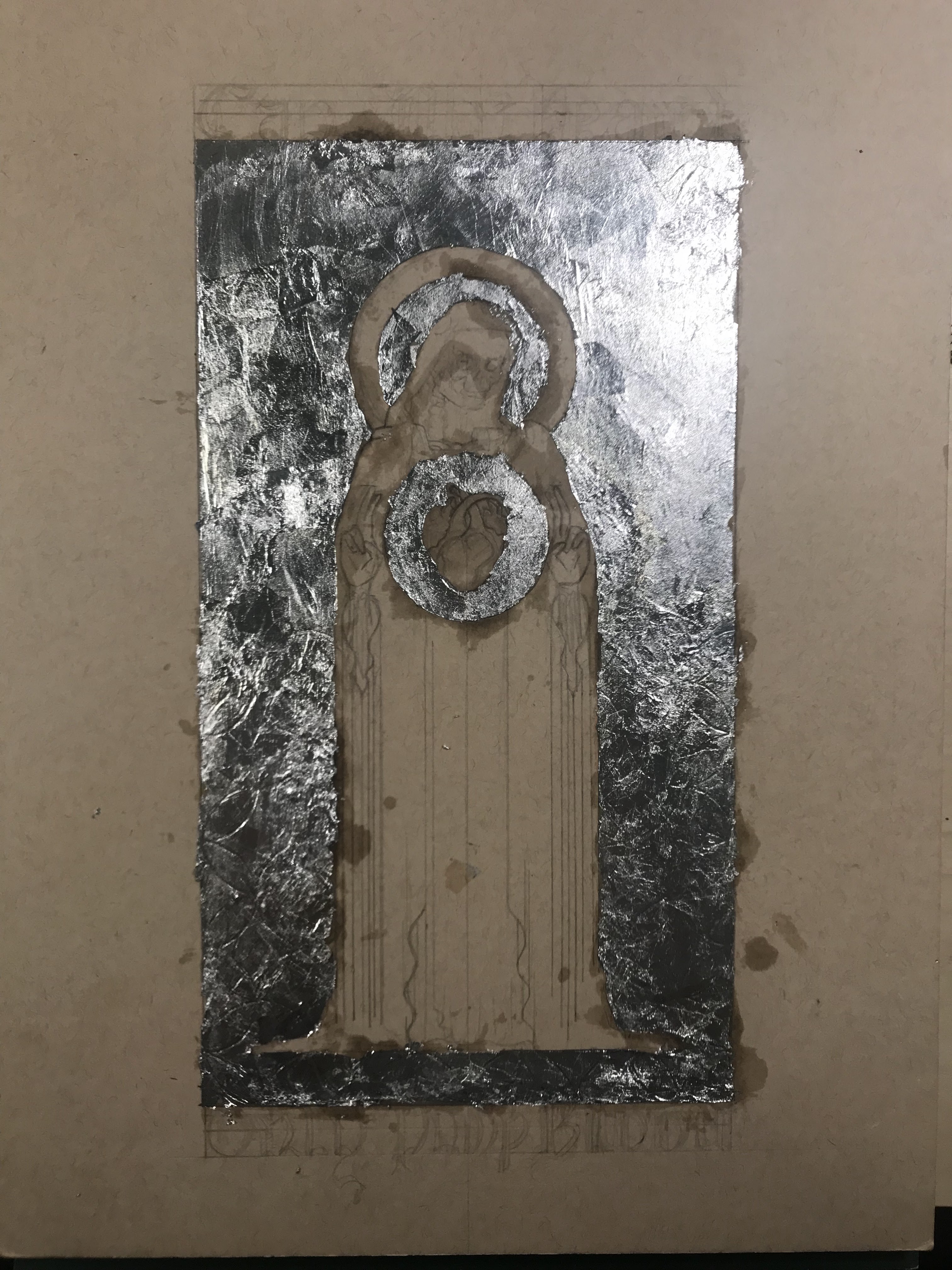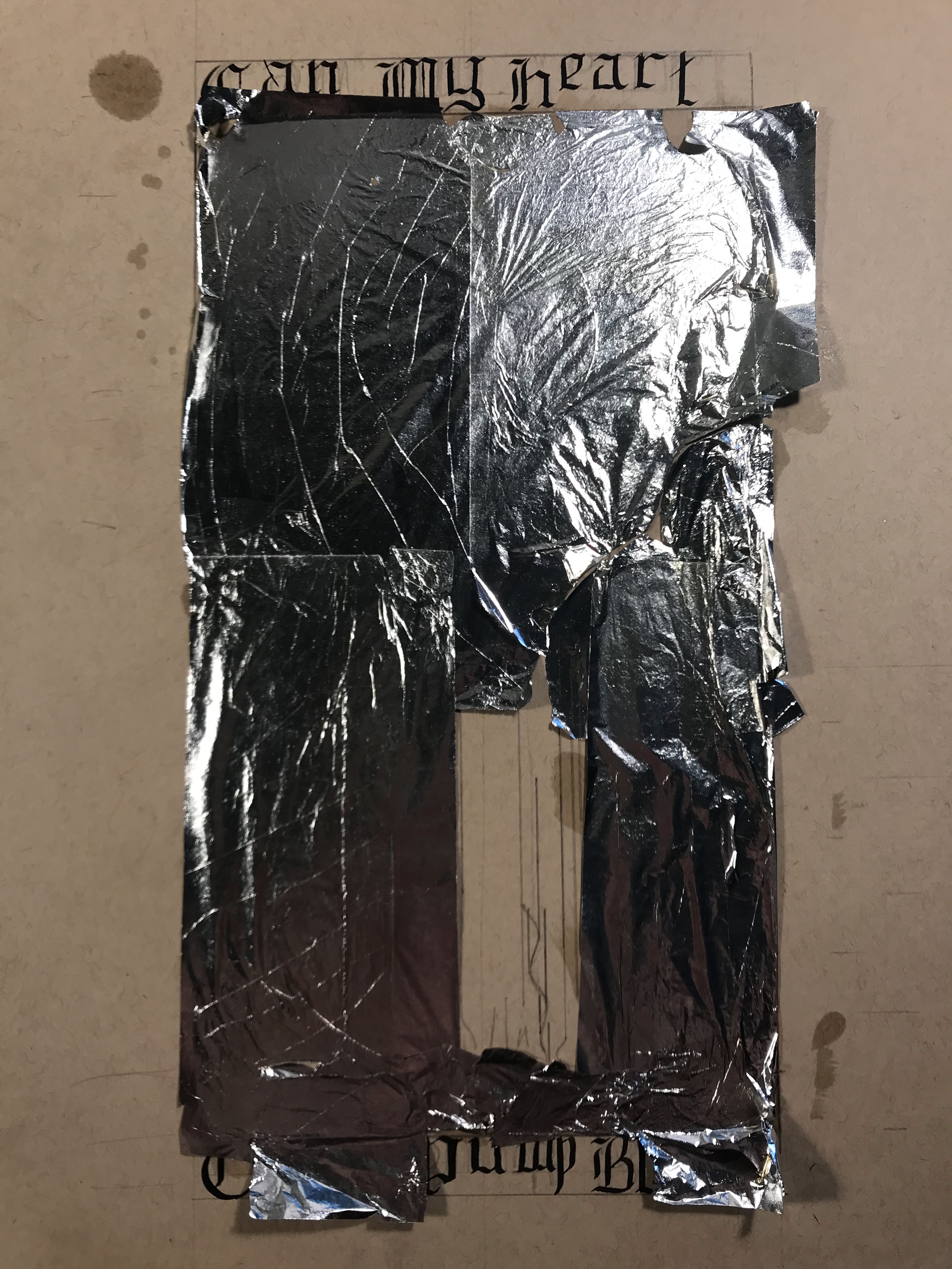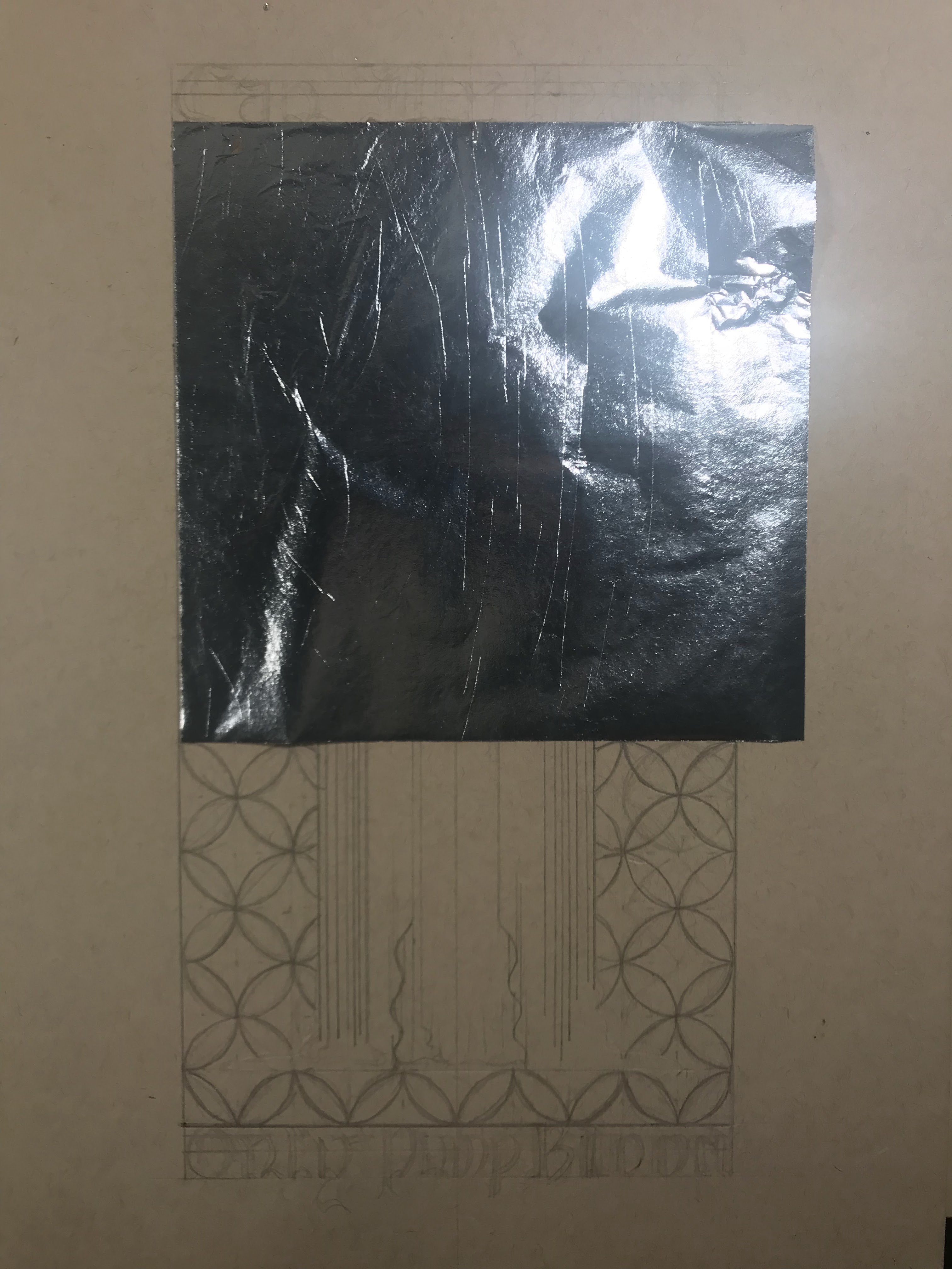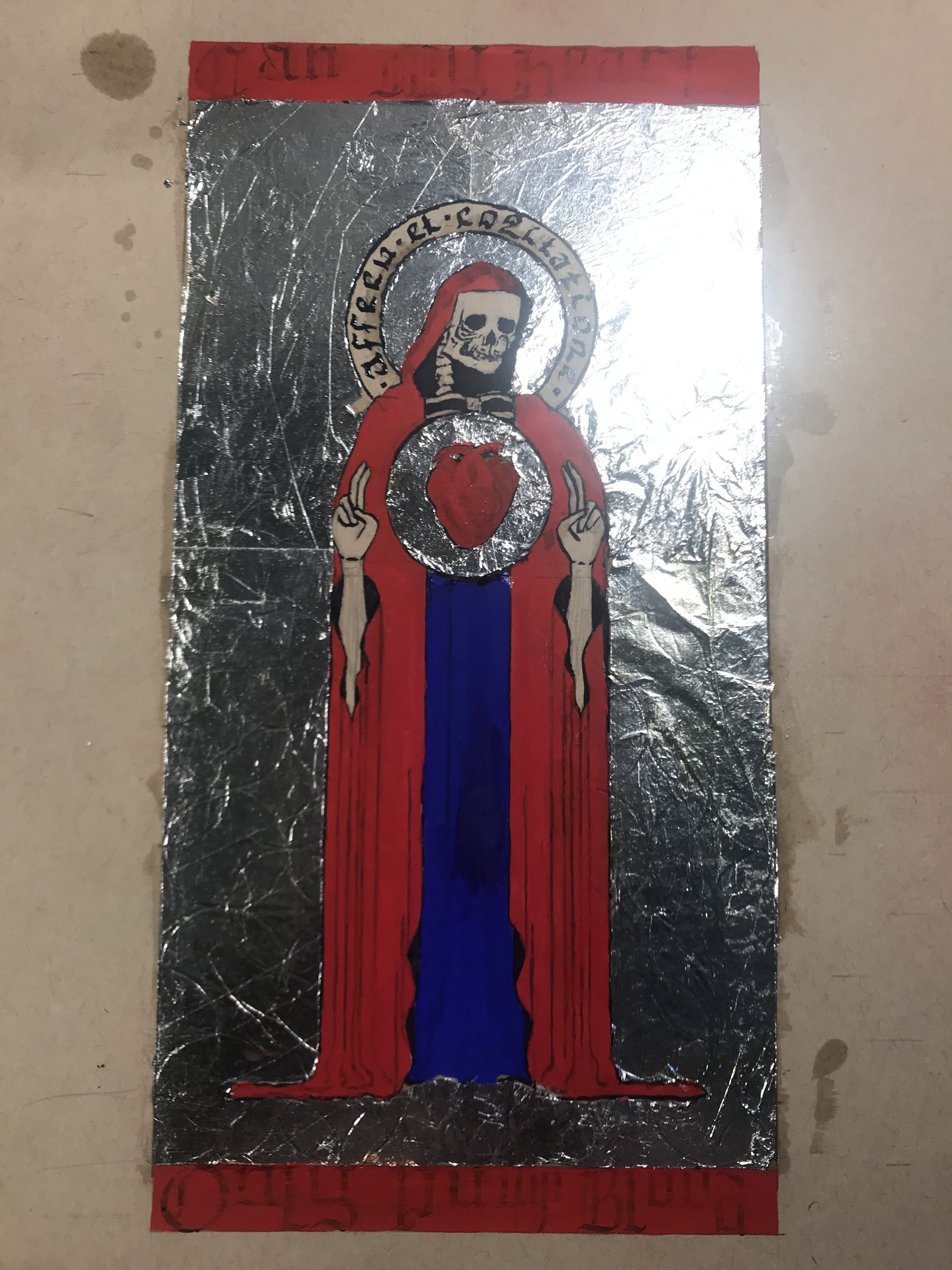 To outline the entire process: I first laid out the design in pencil, and I pressed down enough to make a small imprint on all of the lines. I also took an exacto knife to lightly go over the lines where I would trim the gilding. Then, I applied adhesive and laid the aluminum leaf. After waiting overnight for the adhesive to set, I trimmed the excess gilding and patched up any holes or tears to the best of my ability. I whipped up some egg whites for glair and got some saffron infused to apply onto the aluminum leaf. After that, I inked the letters and figure, then mixed up the pigments in more glair, and painted the rest of the design. Once the paint dried, I inked all of the lines and letters again.