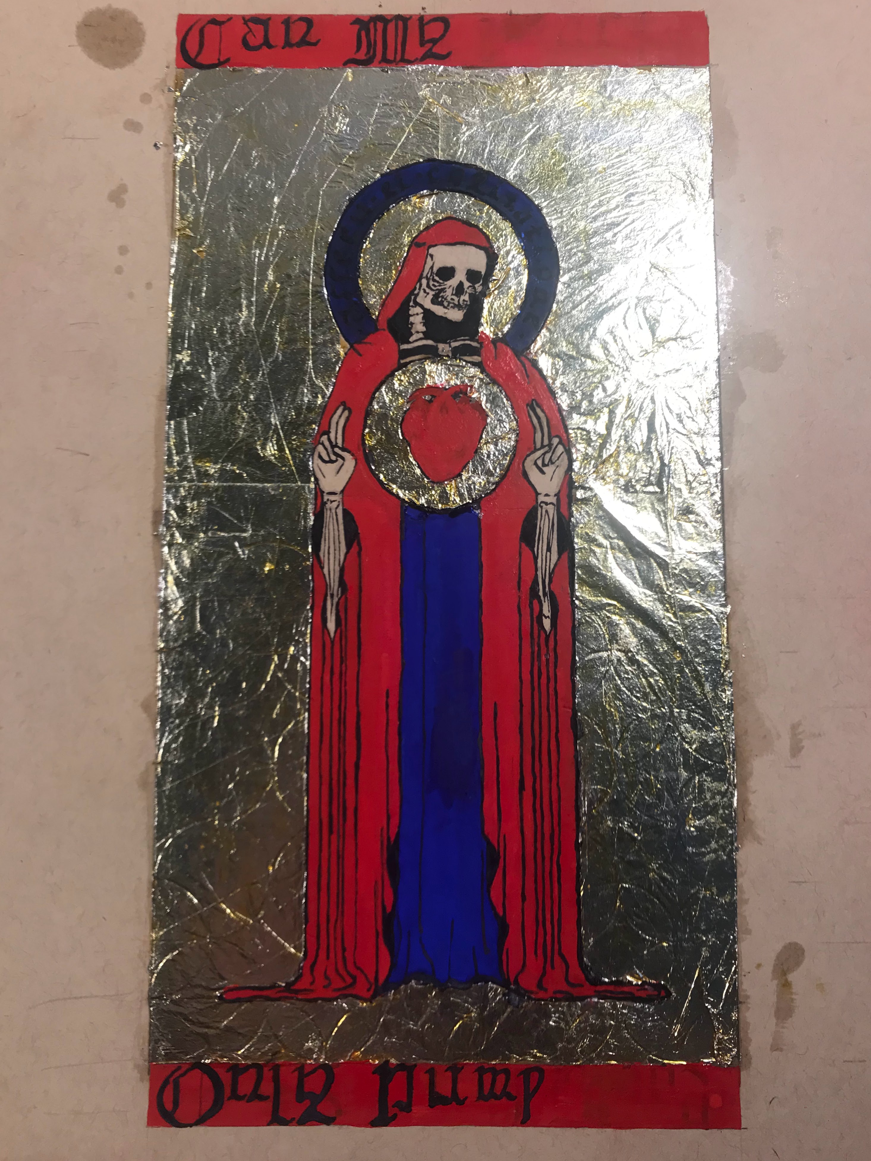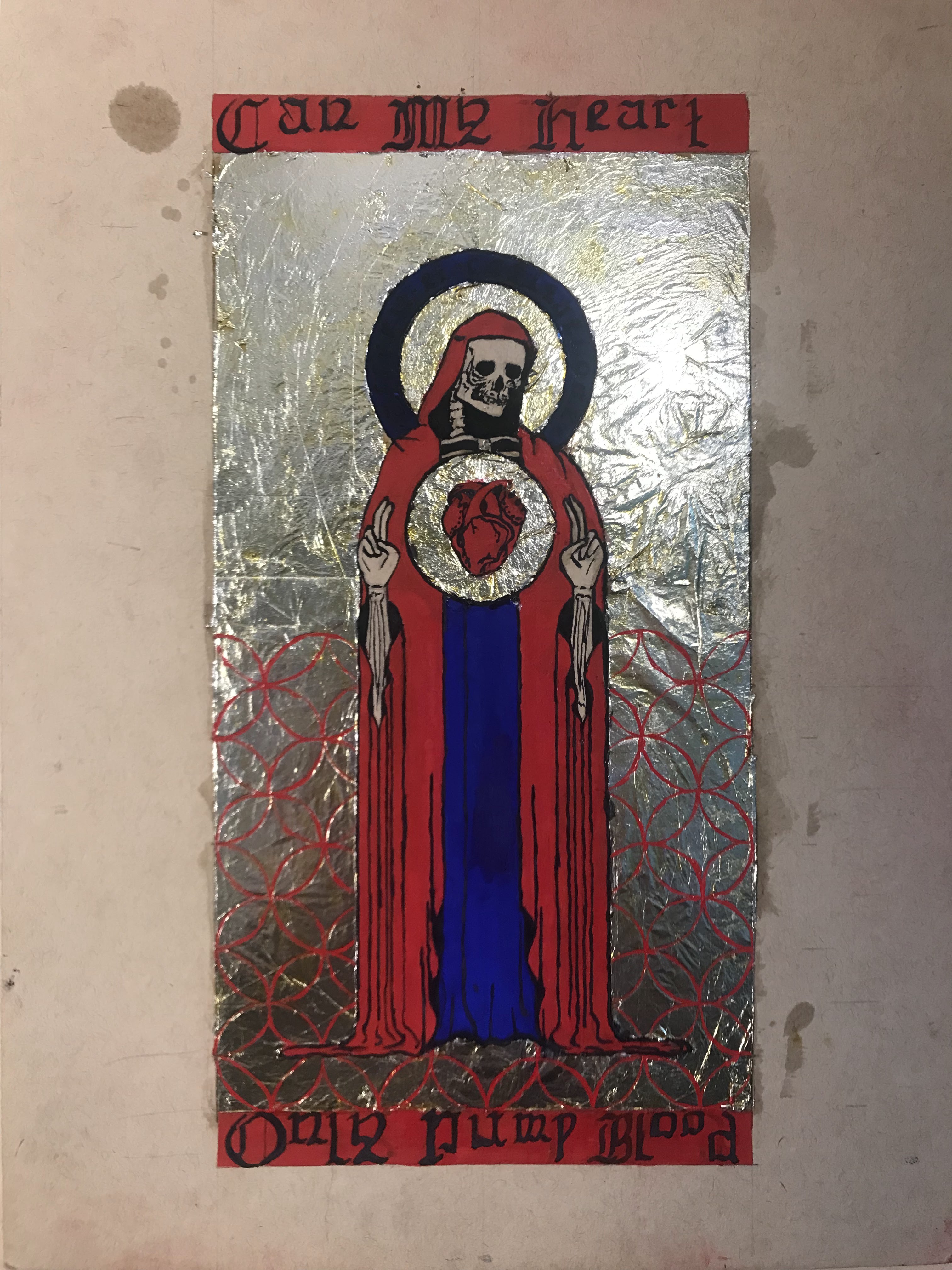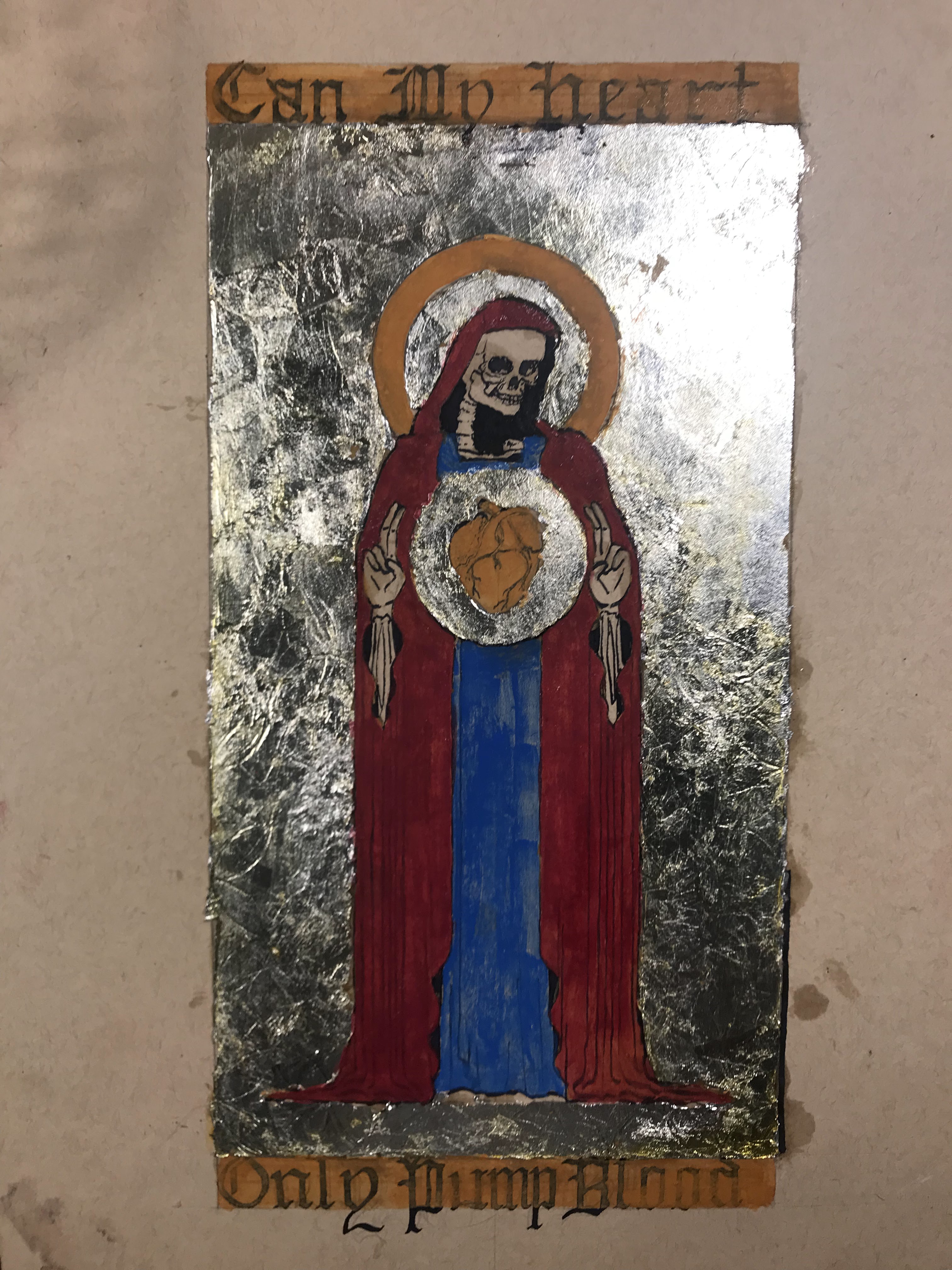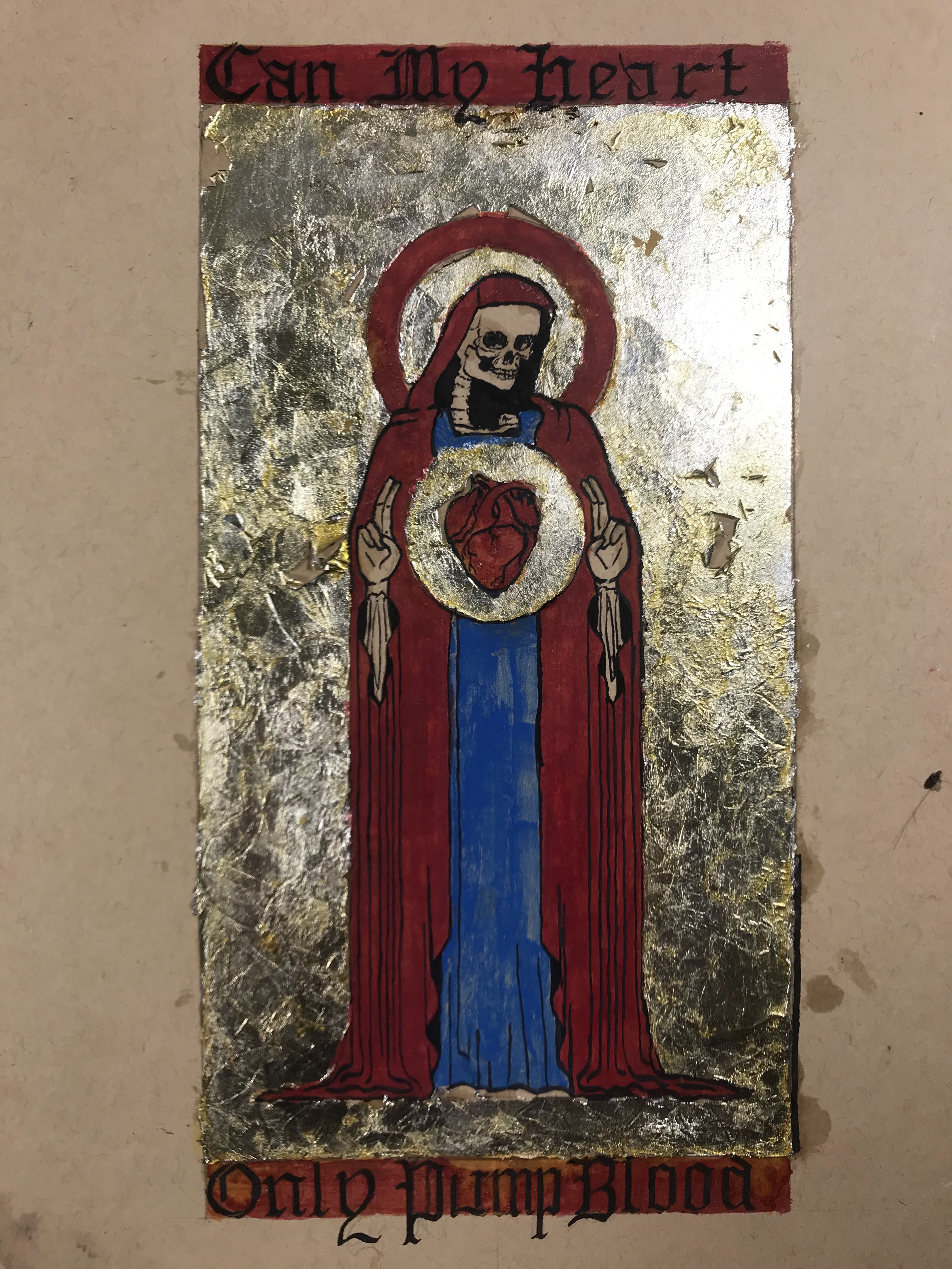 To outline the entire process: I first laid out the design in pencil, and I pressed down enough to make a small imprint on all of the lines. I also took an exacto knife to lightly go over the lines where I would trim the gilding. Then, I applied adhesive and laid the aluminum leaf. After waiting overnight for the adhesive to set, I trimmed the excess gilding and patched up any holes or tears to the best of my ability. I whipped up some egg whites for glair and got some saffron infused to apply onto the aluminum leaf. After that, I inked the letters and figure, then mixed up the pigments in more glair, and painted the rest of the design. Once the paint dried, I inked all of the lines and letters again.