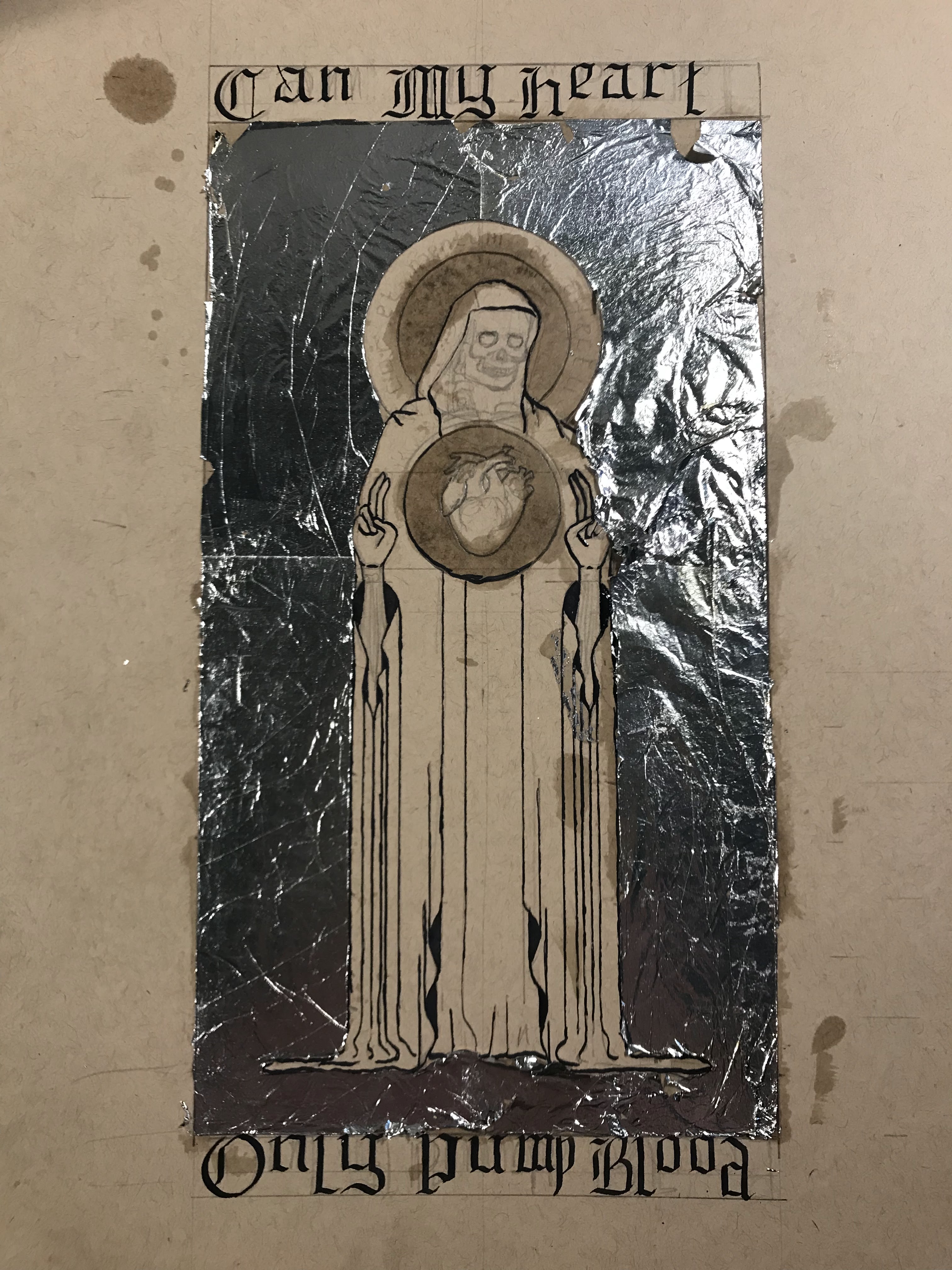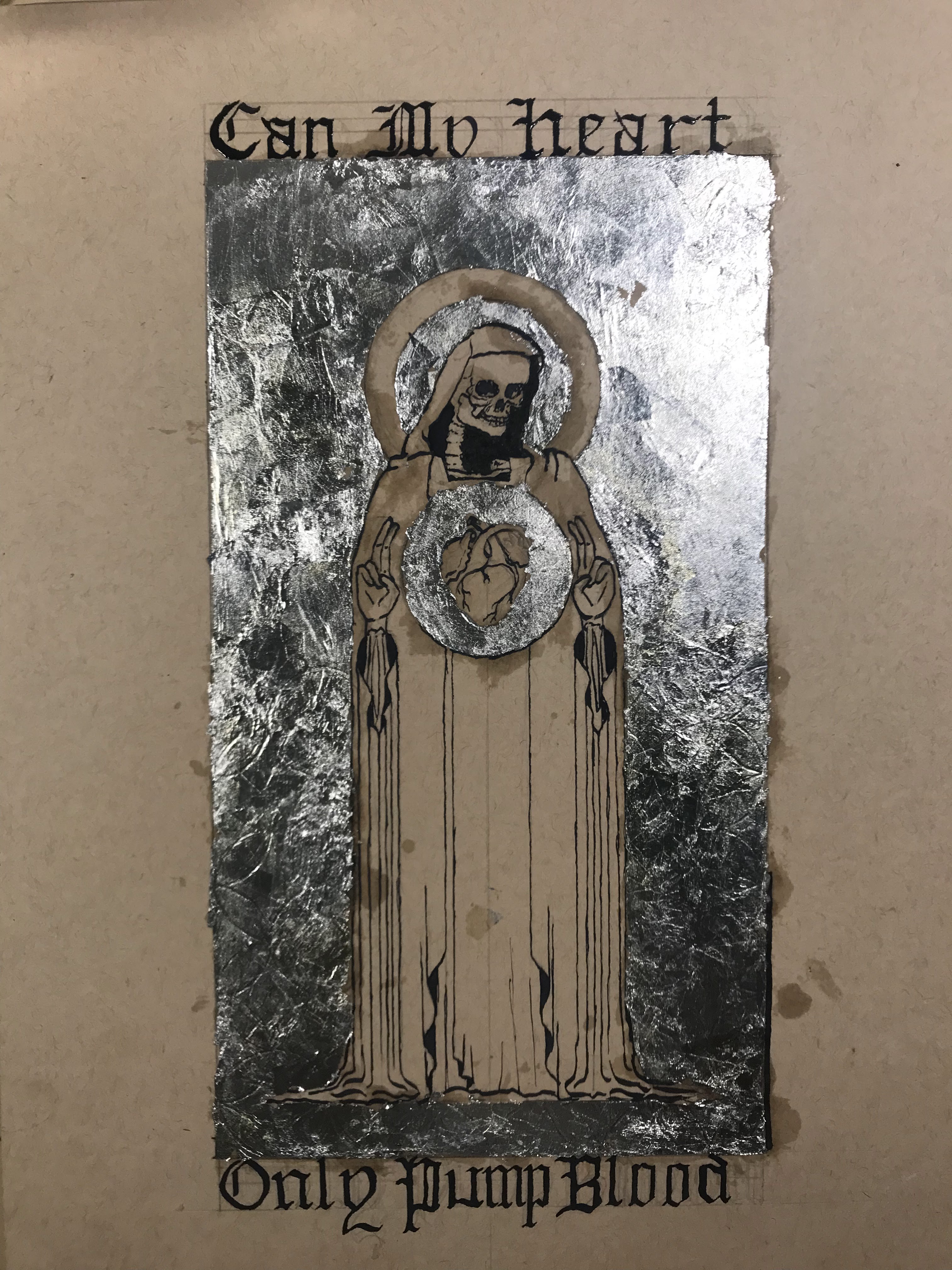 Illuminated manuscripts have been a major inspiration for me over the last couple of years. I am a huge fan of the complete integration of text and design. Most of my information on techniques or materials comes from The Craftsman’s Handbook by Cennini, On Divers Arts by Theophilus, and The Materials and Techniques of Medieval Painting by Daniel V. Thompson. My design comes from a sketch that I made a couple years back, when I was better at coming up with slightly vague and ominous wording to accompany my work. The skeleton mostly represents my aversion to drawing people.