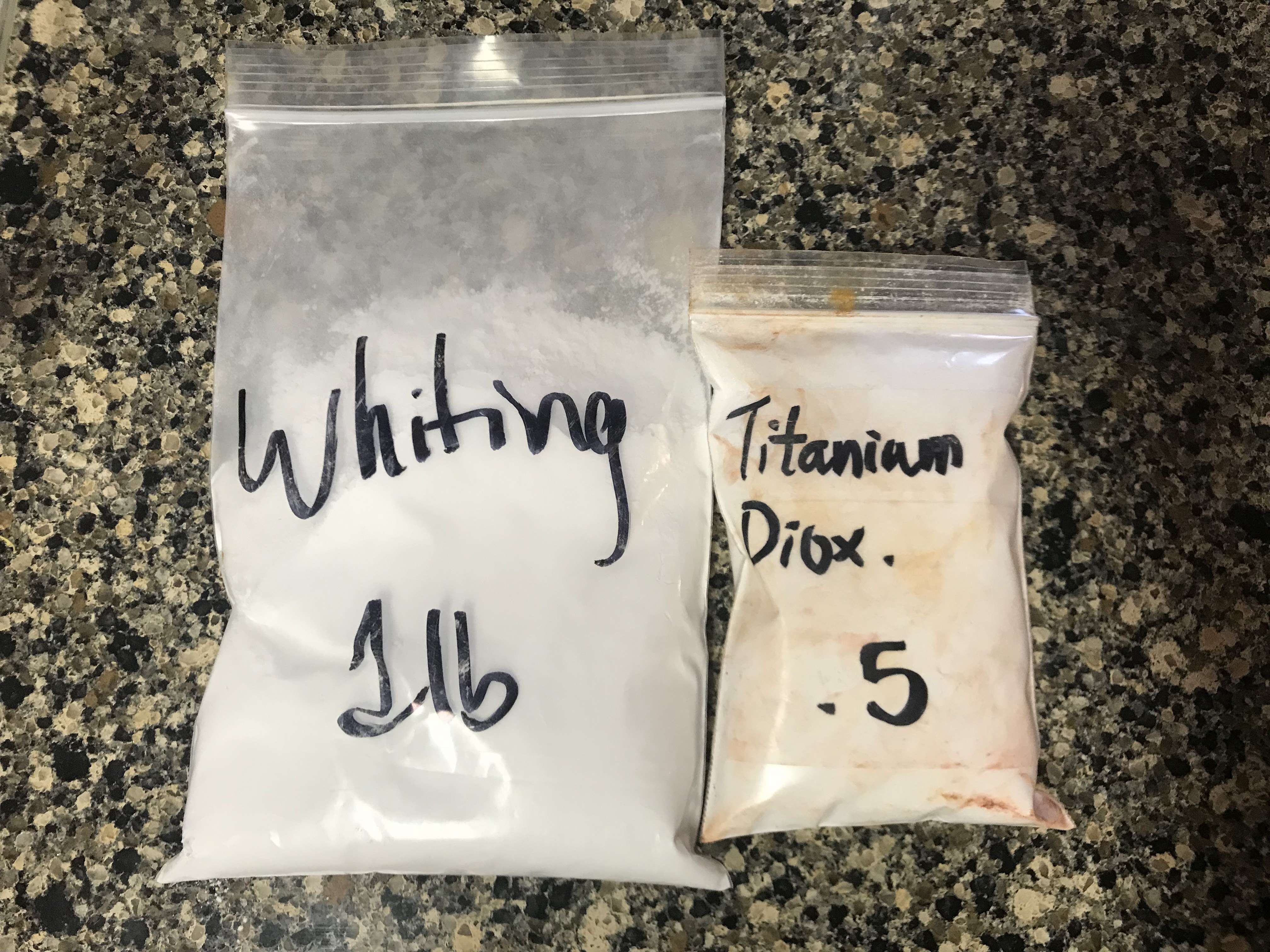 The chemicals come as two dry powders and must be dissolved in water before combining. Both chemicals are made into solutions separately as Part A and Part B, which I mixed by weight and stored in empty hydrogen peroxide bottles. The opaque plastic will store the chemicals longer. The chemicals are iron(III)ammonium citrate and potassium ferricyanide. Combining these chemicals creates a photosensitive solution, which when exposed to sunlight, reacts and causes the iron(III)ammonium citrate to oxidize to ferric ferricyanide. Ferric ferricyanide is insoluble in water, so once the surface has been exposed for long enough, the surface is rinsed with water so any unexposed chemicals or waste chemicals are washed away, leaving the dark blue ferric ferricyanide.