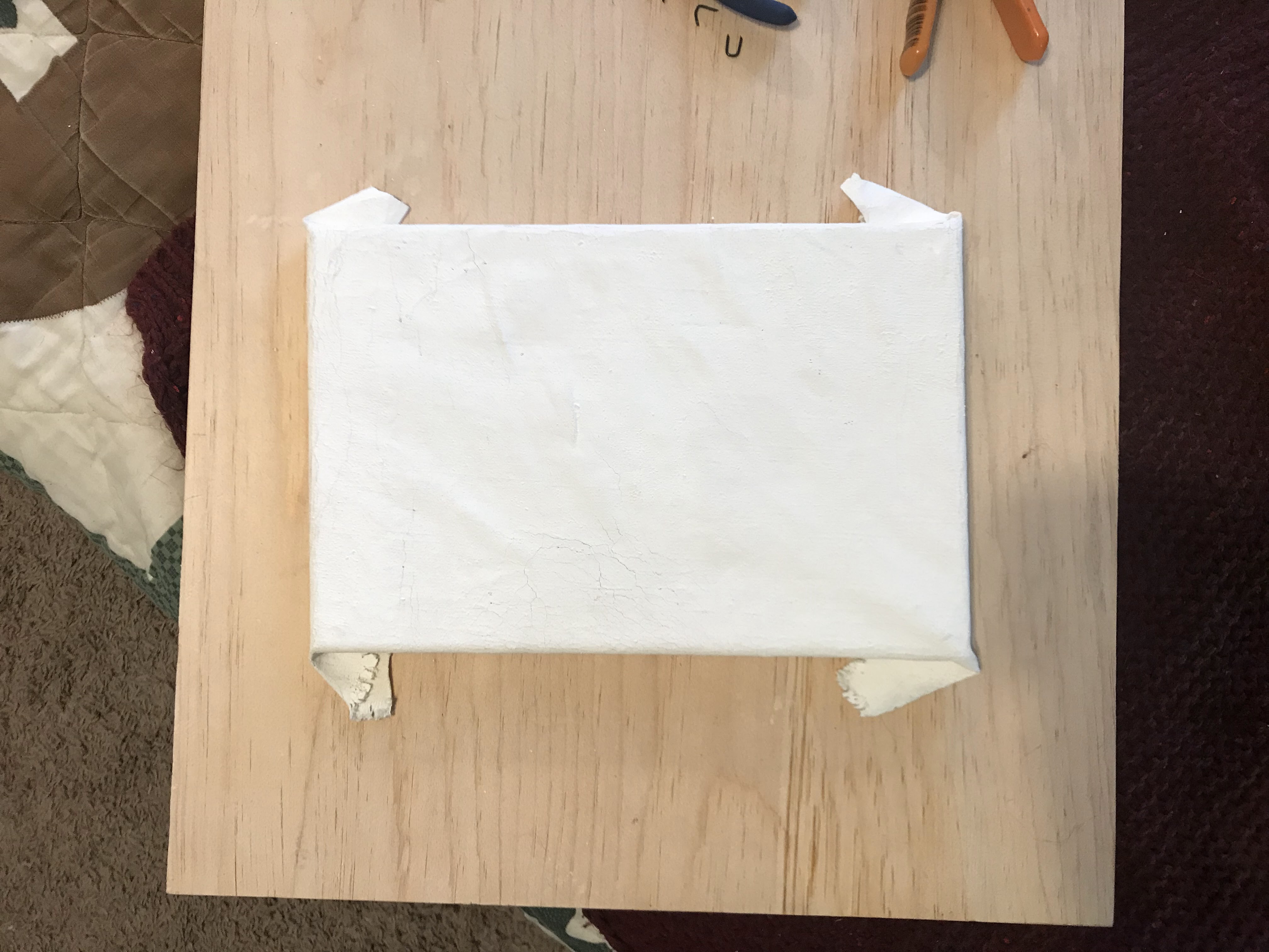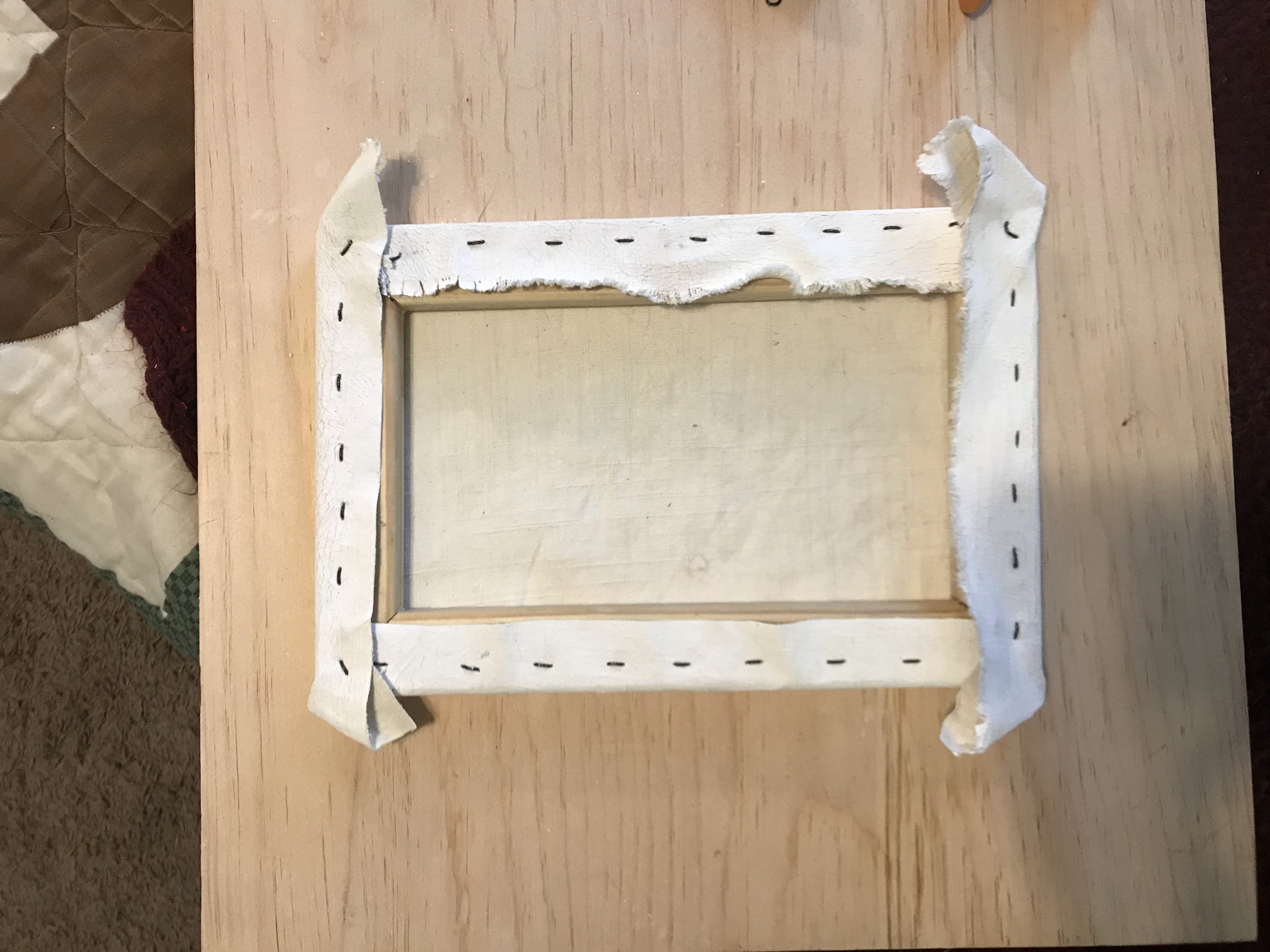 Once the gesso was fully applied and dry, I tried to stretch a canvas with what I made. It was immediately obvious that the gesso had been applied too thickly in some areas and would crack. As always, I just went ahead and tried to make it work anyways. I made the canvas frame from some pine furring strips. I used awful staples and more rabbit skin glue to construct the frame. Then, I cut out a section of canvas and stretched it like any other canvas. It cracked a lot.