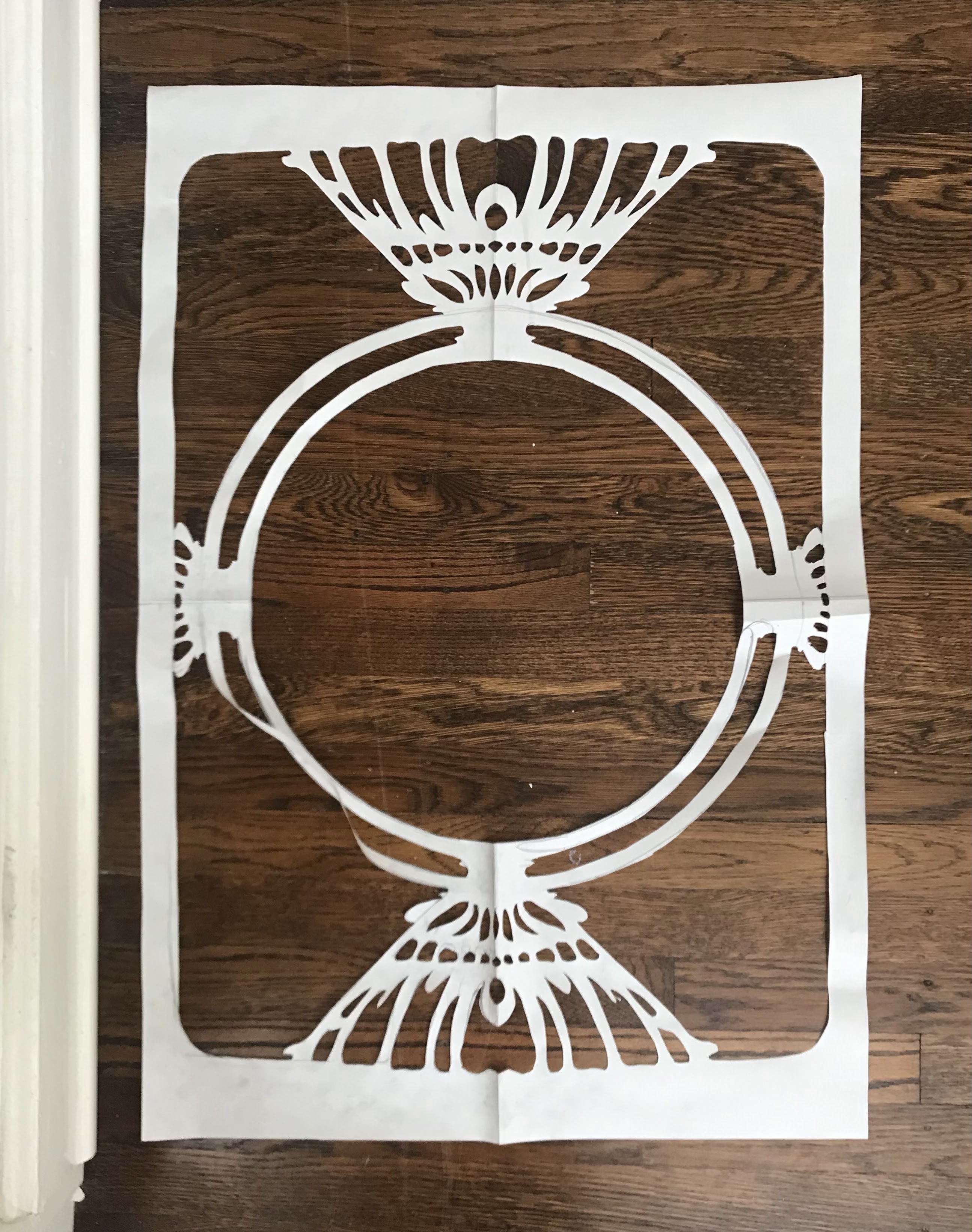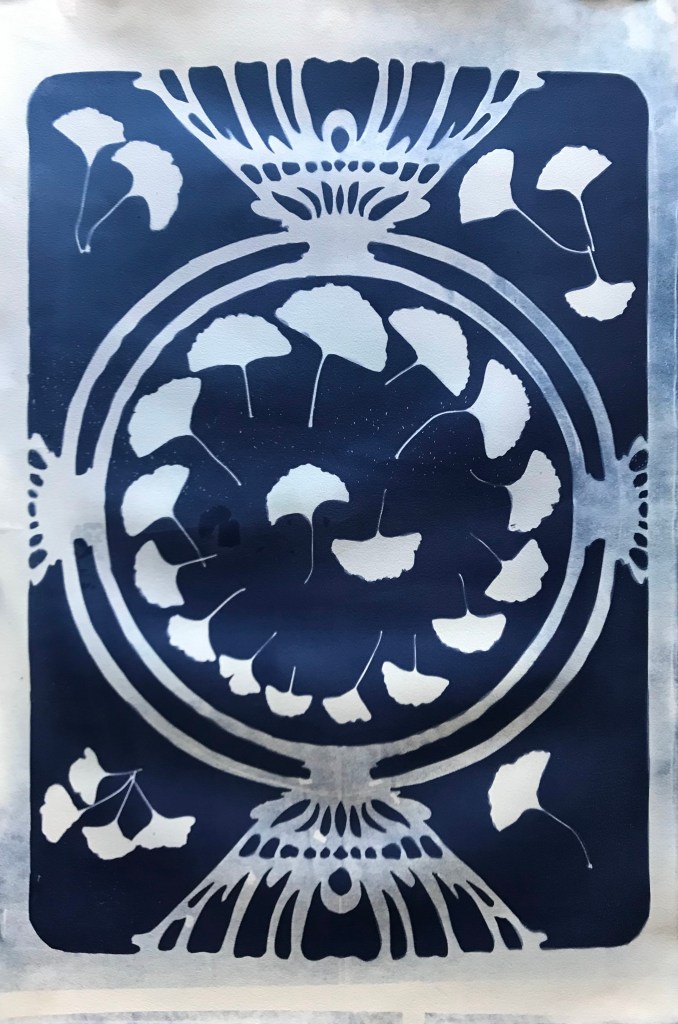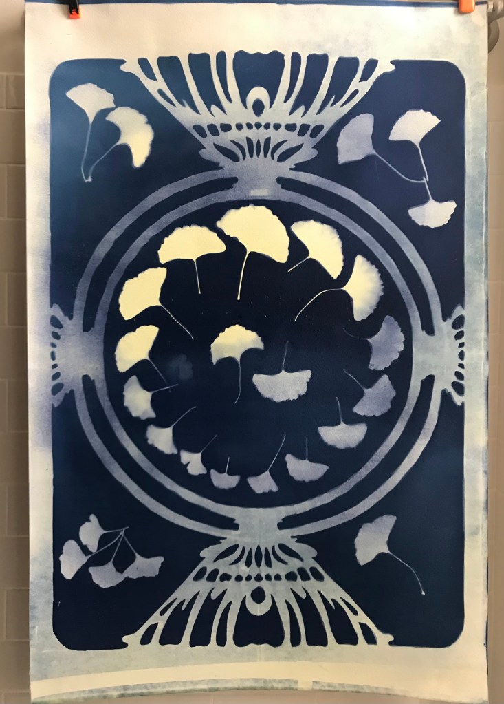 My initial concept for the image that I created was early botanical prints. Cyanotypes were used in botanical study as a way to contact print specimens for accurate reproduction as a replacement for drawing. I also wanted big prints, so I filled up more of the space with a Mucha inspired frame that was traced and cut out of vellum paper.