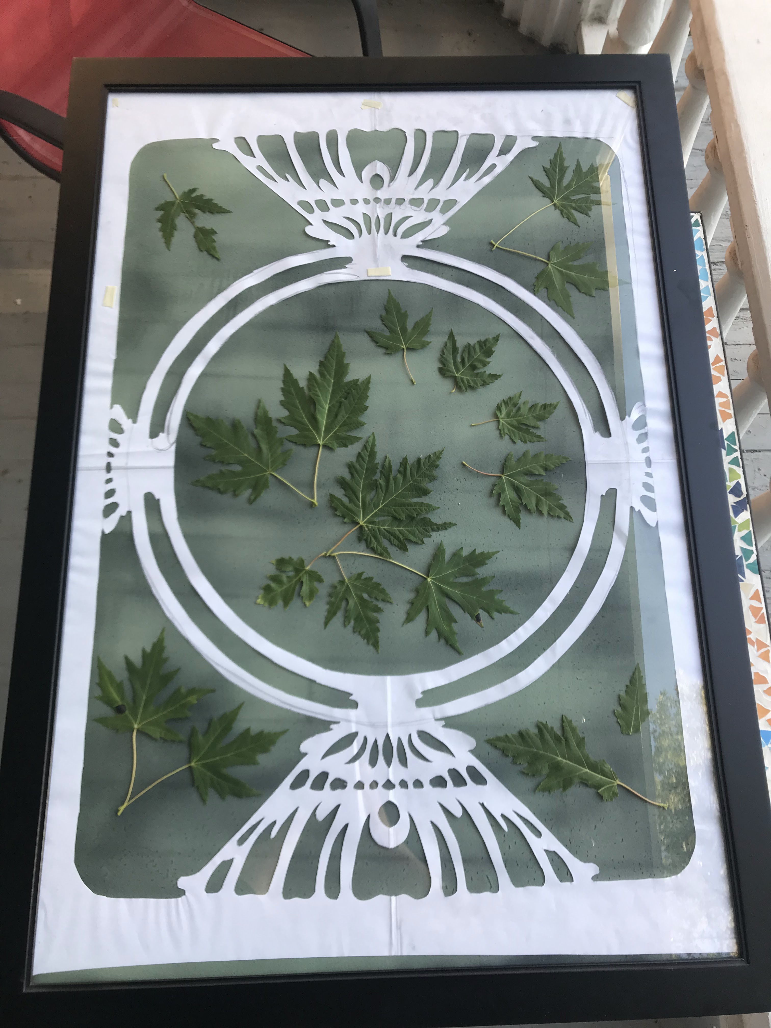 I prepared my print by placing the decorative paper frame on the paper and arranging the leaves around it. The paper and everything on it was then placed between panes of glass and left in the sun. I tried leaving everything in the poster frame, but after a rough print, I realized that the center was not pressed against the glass tightly enough. Luckily, I prepared three papers to expose as contingency for exactly this scenario.