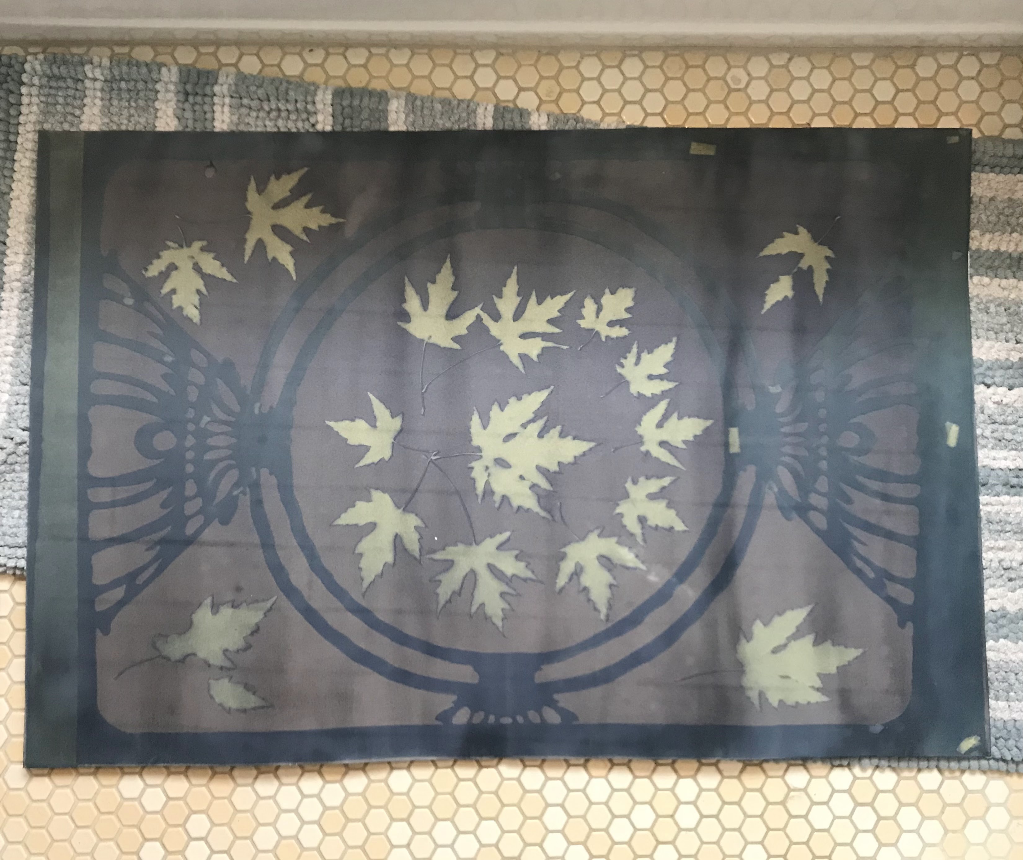 I then hung the prints off a towel rack in the bathroom to dry. The blues continued to get darker and develop as the paper dries. My second print, the ginkgo leaves, was partially exposed before I wanted it to be exposed. It is not super evident in these photos taken immediately afterwards, but this print has since darkened considerably in the frame areas.