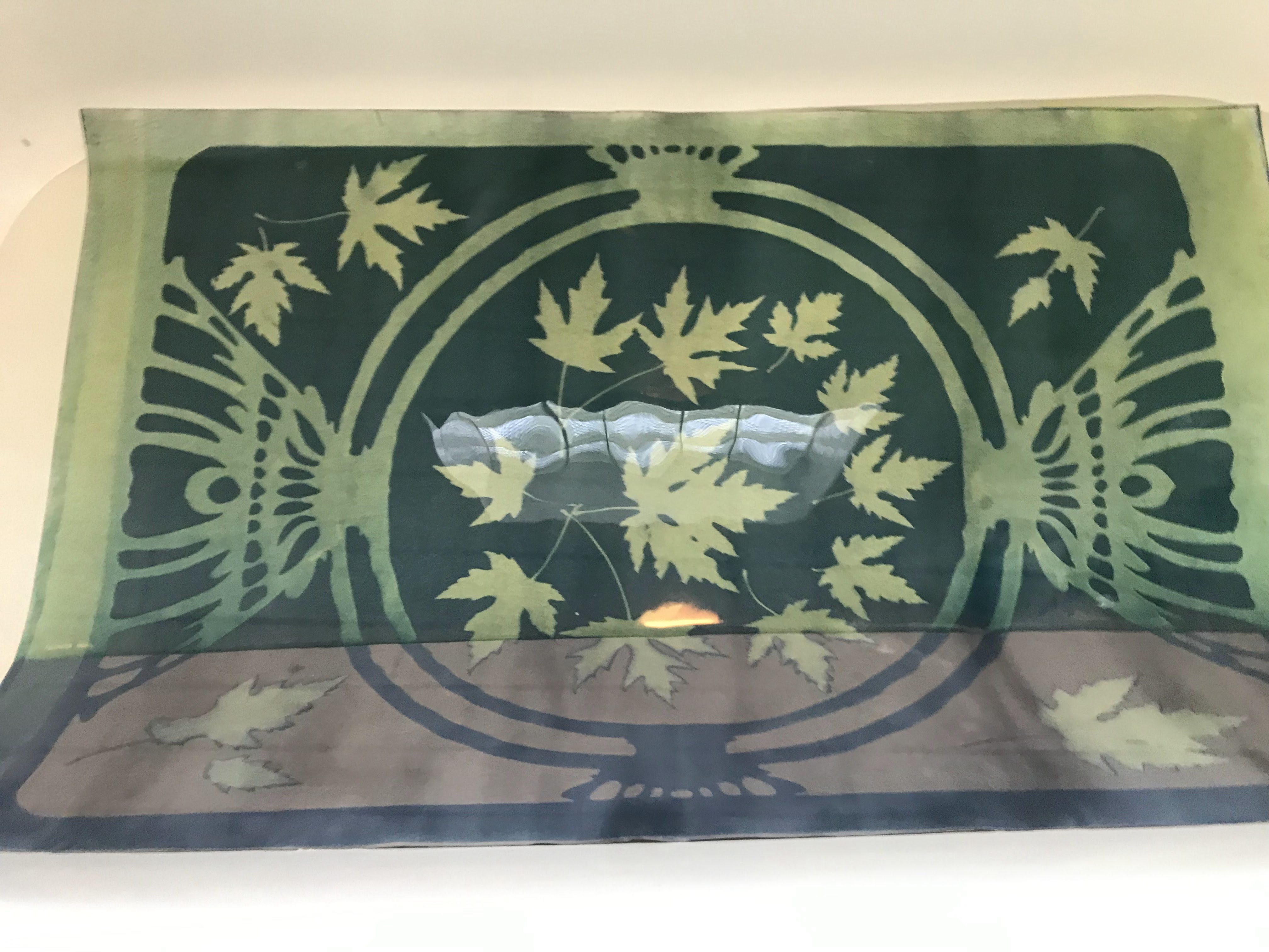 One of the prints directly after exposure. The uncovered background has turned brown, and the where the semi-transparent vellum frame was placed has turned dark blue from partial exposure. The leaf silhouettes are still green from no no light getting through.The print gets washed in water after exposure. Notice the difference in color as it comes into contact with water. The color washes away from the underexposed frame and leaves. The brown background turns dark blue as it became insoluble in water after exposure. After washing, the paper is no longer photosensitive.